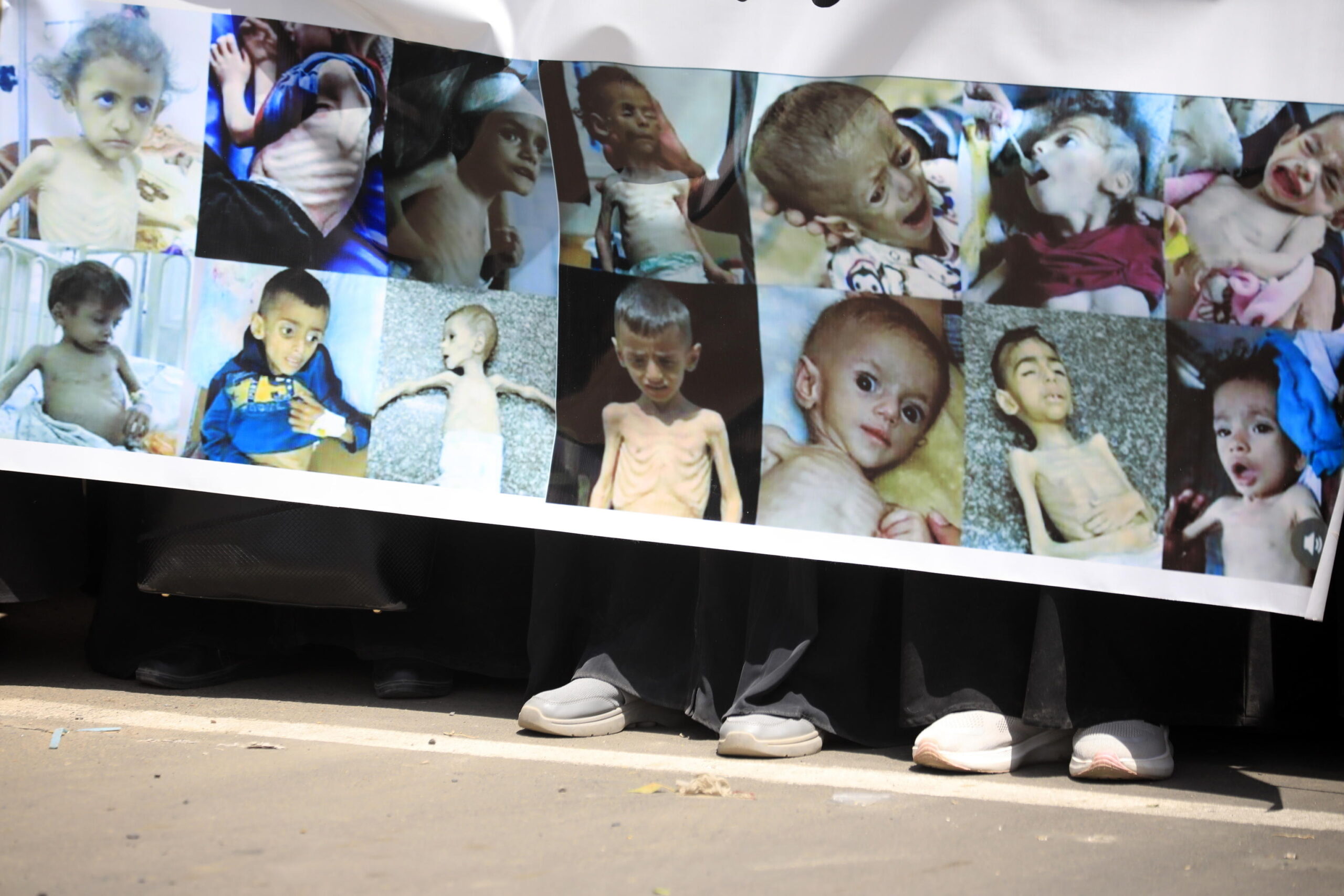 Manifestanti tengono uno striscione raffigurante bambini palestinesi che soffrono di grave malnutrizione, durante una manifestazione che chiede la fine della guerra a Gaza, presso l’Università di Sana’a, a Sana’a, Yemen, il 23 luglio 2025. Ansa, EPA/YAHYA ARHAB