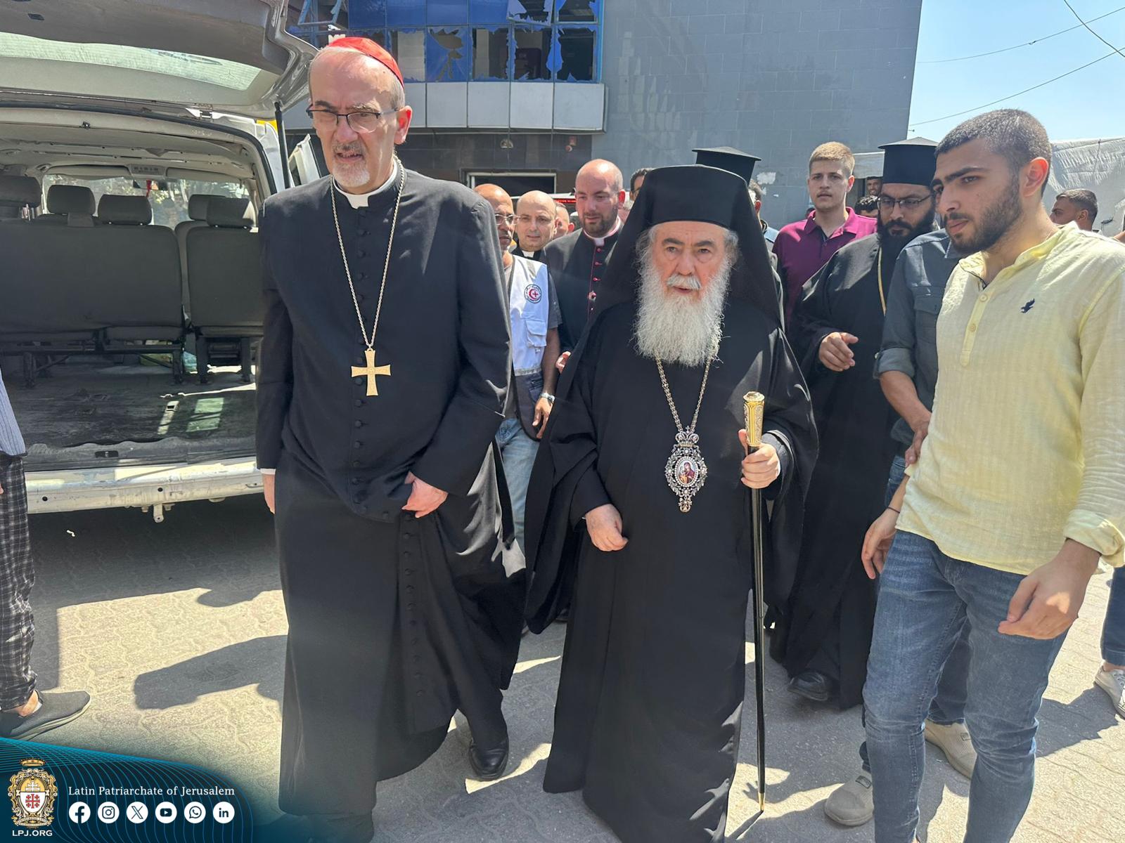 I patriarchi Pizzaballa e Teofilo III lo scorso luglio a Gaza dopo il bombardamento della parrocchia della Sacra Famiglia. Foto del Patriarcato latino di Gerusalemme
