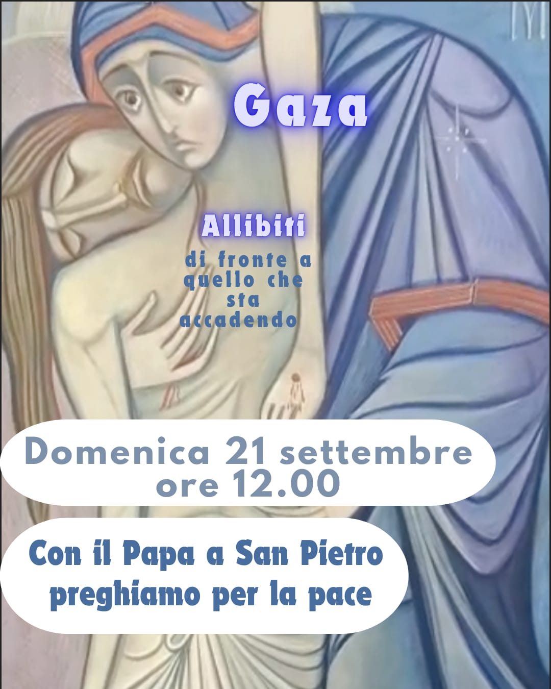 Insieme con il papa, nell’Angelus di domenica 21 settembre, in piazza San Pietro ci saranno i rappresentanti di diverse organizzazioni per «implorare Maria, Regina della pace: la sua intercessione ottenga riconciliazione e pace per la Terra Santa». L’iniziativa segue il flash mob “Una luce per Gaza” che si è svolto il 14 settembre in piazza del Popolo, su iniziativa di un gruppo di associazioni: Agesci Lazio, Azione Cattolica Roma, Caritas Roma, Movimento dei Focolari Roma, Pax Christi Italia, ACLI Roma, Associazione culturale Premio internazionale Achille Silvestrini per il dialogo e la pace, Unione dell’Apostolato Cattolico, Associazione Donne in Vaticano, Insieme per l’Europa Roma, Federazione Italiana Settimanali Cattolici (FISC)-Lazio, Associazione Comunità Domenico Tardini.