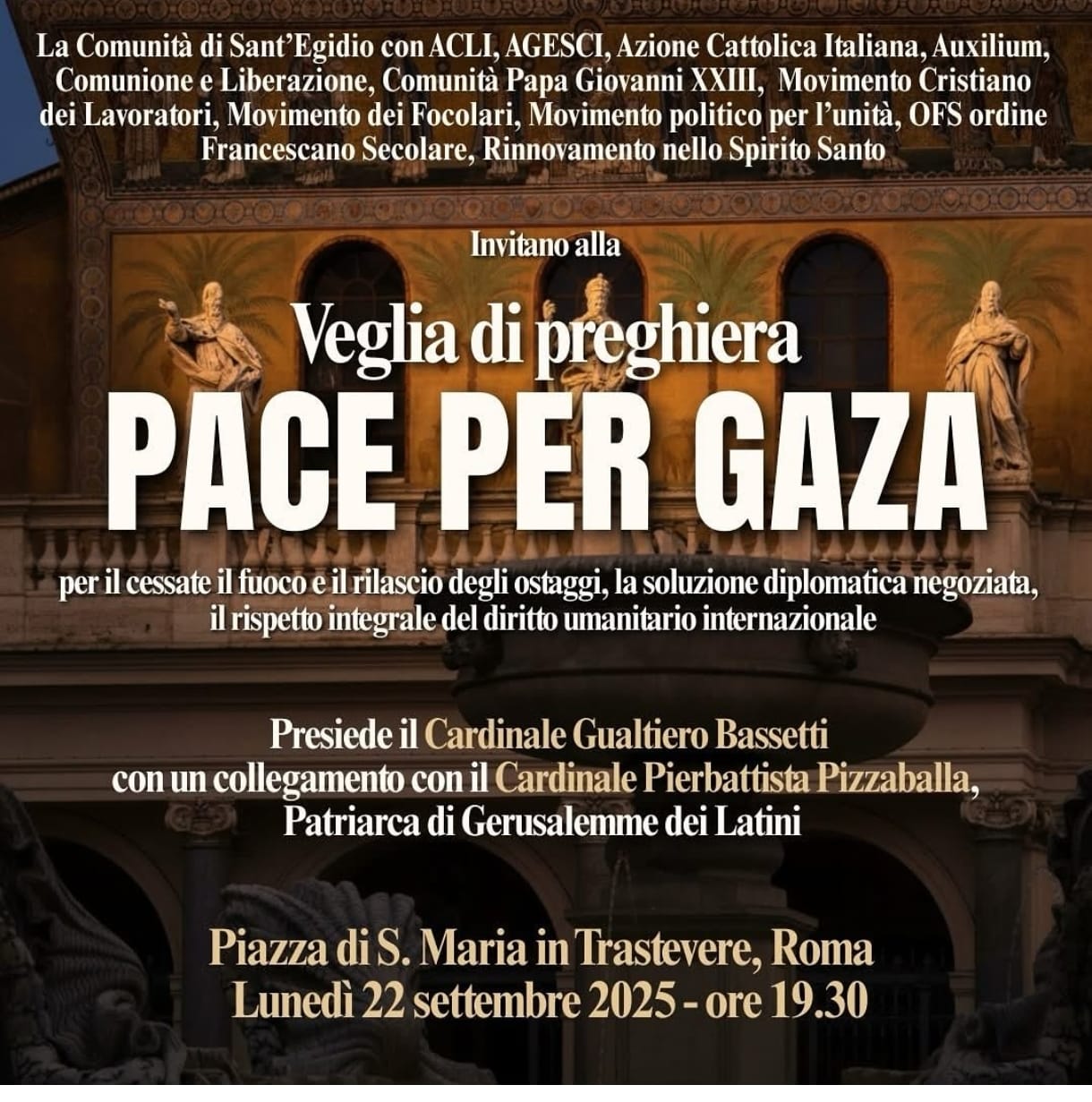 Promotori di una veglia di preghiera dal titolo “Pace per Gaza” sono la Comunità di Sant’Egidio con Acli, Agesci, Azione Cattolica italiana, Auxilium, Comunione e Liberazione, Comunità Papa Giovanni XXIII, Movimento Cristiano dei lavoratori, Movimento dei Focolari Movimento politico per l’Unità, OFS ordine francescano secolare, Rinnovamento nello Spirito Santo. L’appuntamento è per le 19.30 in piazza Santa Maria in Trastevere, nella Capitale. Presiederà la veglia il cardinale Gualtiero Bassetti. Sarà presente con un collegamento online il patriarca latino di Gerusalemme, Pierbattista Pizzaballa. I promotori chiedono il cessate il fuoco nella Striscia di Gaza, il rilascio degli ostaggi ancora nelle mani di Hamas, una risoluzione diplomatica negoziata, il rispetto integrale del diritto umanitario internazionale.