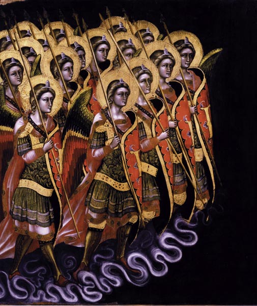 Ecco l’angelo che pesa le anime con la bilancia dove un diavolo vuole, invano, ghermire un’anima; l’angelo-soldato dalle ali dorate sul fondo buio – era azzurro, ora il tempo l’ha scurito –; poi quello che ha incatenato Satana e ci guarda con occhio fermo, biancovestito, con ali dai colori dell’arcobaleno. L’angelo mite che accoglie due poveri in ginocchio: l’umanità di Guariento si esprime con la tenerezza di chi conosce la povertà umana e spirituale. E infine la schiera fulgida del coro angelico che corre su nubi violacee, con i colori surreali del mondo risorto, già prima di un Mirò. Una visione corale cui manca solo la musica di Bach.