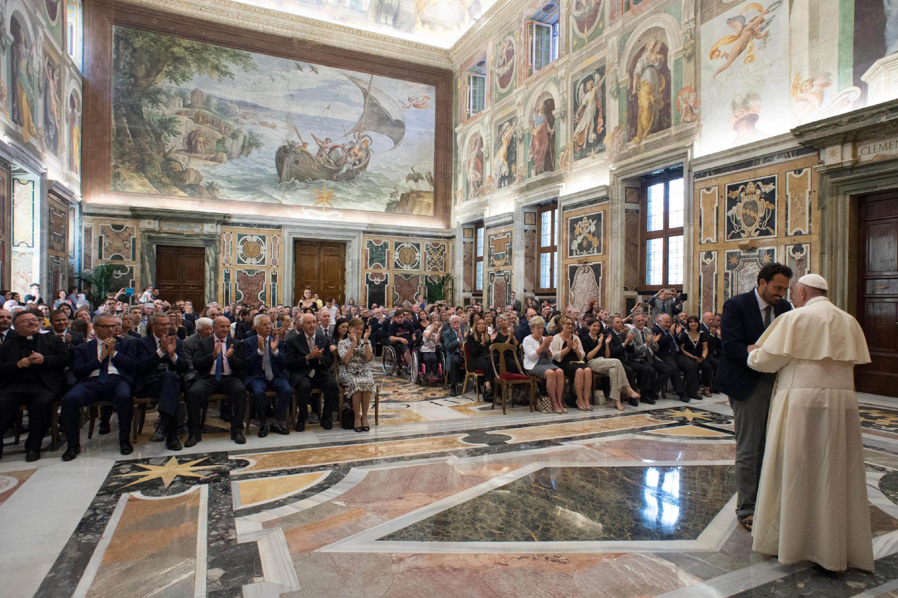 Poi, un altro problema che vediamo in Amoris laetitia è l’educazione dei figli. Non è facile educare i figli. Oggi i figli sono più svelti di noi! Nel mondo virtuale, loro ne sanno più di noi. Ma bisogna educarli alla comunità, educarli alla vita familiare. Educarli al sacrificio gli uni per gli altri. Non è facile educare i figli. Sono problemi grossi. E voi, che amate la famiglia, potete aiutare tanto in questo le altre famiglie. La famiglia è un’avventura, un’avventura bella! E oggi – con dolore lo dico – vediamo che tante volte si pensa a incominciare una famiglia e a fare un matrimonio come fosse una lotteria: “Andiamo. Se va, va. Se non va, cancelliamo la cosa e incomincio un’altra volta”. Questa superficialità sul dono più grande che ha dato Dio all’umanità: la famiglia. Perché, dopo il racconto della creazione dell’uomo, Dio fa vedere che creò l’uomo e la donna a sua immagine e somiglianza. E Gesù stesso, quando parla del matrimonio, dice: “L’uomo lascerà il padre e la madre e con sua moglie diventeranno una sola carne”. Perché sono immagine e somiglianza di Dio. Voi siete icona di Dio: la famiglia è icona di Dio. L’uomo e la donna: è proprio l’immagine di Dio. Lui lo ha detto, non lo dico io. E questo è grande, è sacro.