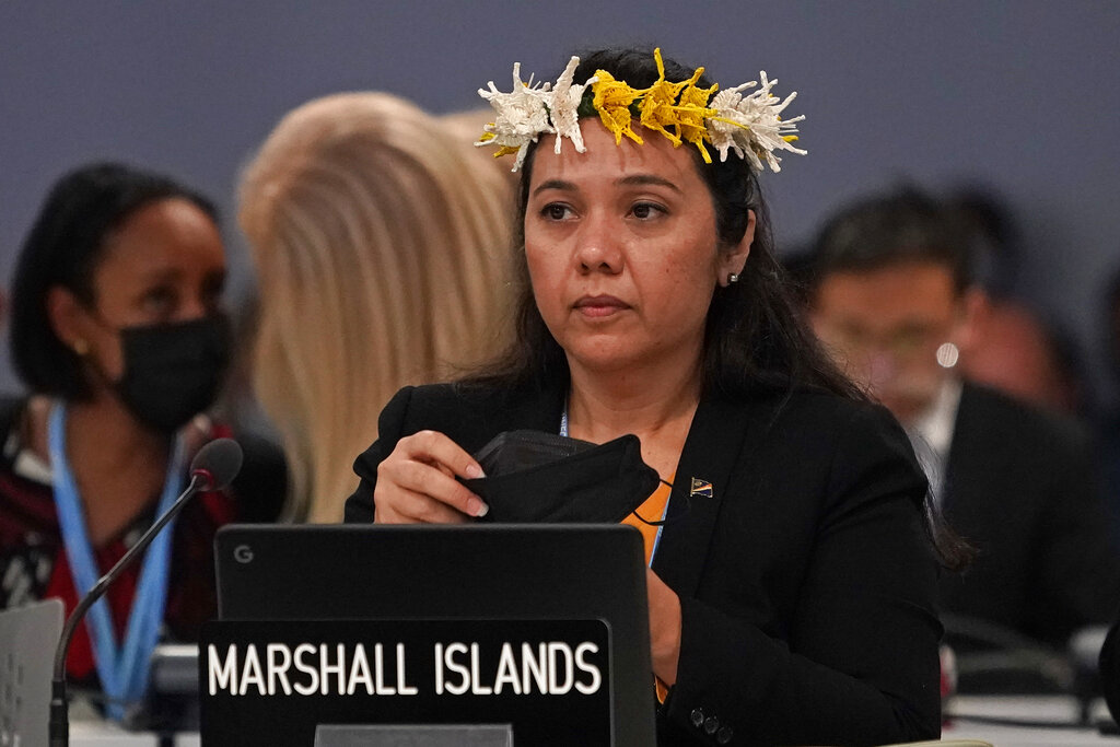Kristina E. Stege, delegata delle Isole Marshall alla COP26. Molte isole nel mondo rischiano di essere sommerse dall’aumento del livello del mare. (AP Photo/Alberto Pezzali)