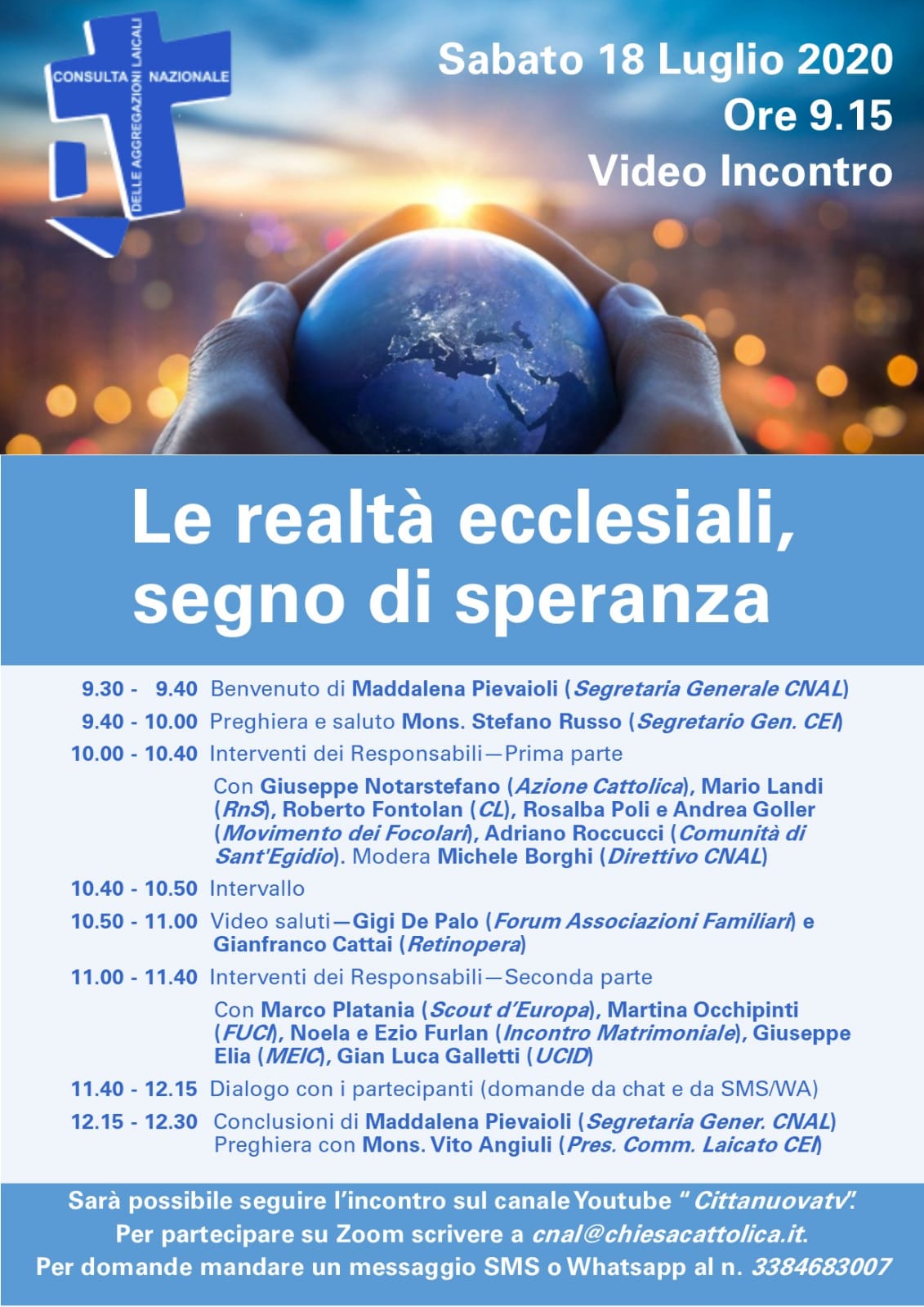Il prossimo sabato 18 luglio alle ore 9.15 la Consulta nazionale delle aggregazioni laicali (CNAL) promuove un video incontro (rivedilo su YouTube), dal titolo particolarmente significativo in questo tempo di pandemia – “Le realtà ecclesiali, segno di speranza” -, cui interverranno il Segretario generale della Cei, mons. Russo e alcuni presidenti e responsabili nazionali di movimenti e aggregazioni Laicali.