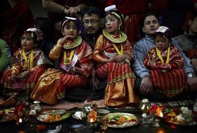Sono le famiglie della comunità Newar, che in questi giorni, come ogni anno, hanno dato alcune delle loro bambine fra i sei e i nove anni in spose al dio. Le origini di questa tradizione non sono chiare, ma si è convinti che debbano essere rintracciate nella paura, per altro tipica delle famiglie del subcontinente indiano, che le figlie possano essere violentate o sfruttate sessualmente. In tal caso, oltre l’onta per l’intera famiglia, il grande problema sarebbe quello di trovar loro marito. Per questo, prima di raggiungere la pubertà, vengono date in moglie a Vishnu che, in tal modo, deve provvedere a difenderle da chiunque possa importunarle o approfittarne.