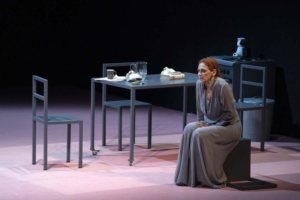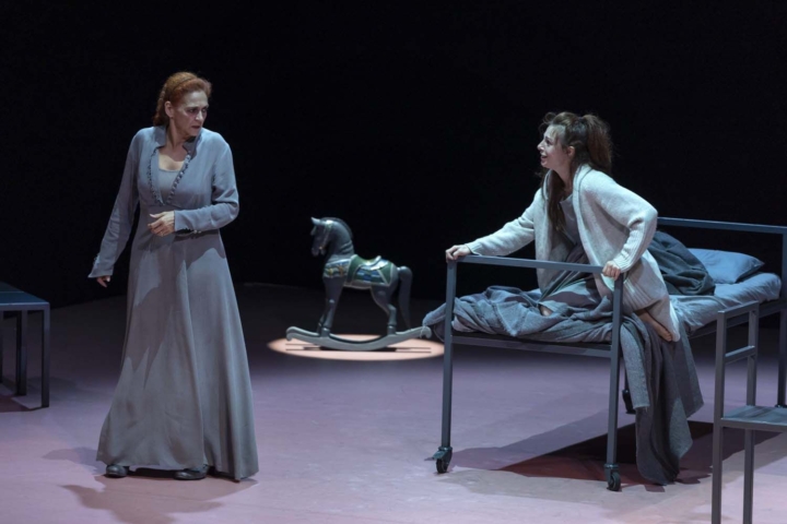 Lo stesso sentimento pervade la regia di Chiodi che trasporta la tragedia in un grigio interno domestico con quattro porte, un tavolo e delle sedie metalliche, un letto, una poltrona e un cavalluccio a dondolo. Vissuto come un luogo di costrizione, c’è nella messinscena un chiaro richiamo al tempo pandemico che abbiamo attraversato. Lo ravvisiamo in questa reclusione forzata delle quattro donne, dai costumi sobri e domestici, dentro l’unica stanza, come se vivessero una sorta di lockdown in attesa di sapere cosa ne sarà del loro futuro; e, ancora, nel Coro, costituito non da donne in carne ed ossa ma da quadrati di volti proiettati in video in un’unica grande schermata Zoom – strumento che abbiamo imparato a usare per supplire alla mancanza fisica di comunicazione –, mentre scorrono e si odono le loro parole tradotte anche in greco.
