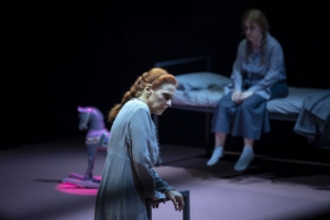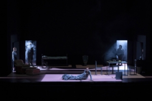 A Talbitio (Graziano Piazza), il messaggero funesto degli Achei, freddo e ambiguo, tocca il compito di annunciare con l’arroganza del potere, a quale triste sorte saranno destinate le donne, salvo infine manifestare un briciolo di umanità nel racconto della morte del piccolo Astianatte. Elena (Alessia Spinelli) è presentata come una ragazza tutta social, oziosamente presente in un angolo sprofondata su una poltrona tra computer e cellulare, incurante del dolore delle donne, per poi intervenire al microfono davanti ad una webcam, nella sua dialettica difensiva, per affermare la propria vanità e bellezza, compiaciuta della sua procace immagine riprodotta sullo schermo. Al turbamento psichico di Cassandra (Federica Fracassi), adolescente con grandi occhialoni e trecce, ghignante strumento di morte (come, nel suo lucido delirio, profetizza) per Agamennone, che se n’è invaghito e si accinge a condurla con sé ad Argo, segue l’affranta maternità di Andromaca (Valentina Bartolo) cui viene sacrificato e condannato il figlioletto. Messinscena, questa di Troiane, di grande tensione, che è una risorsa per attrici individuali la cui prova costituisce un magma corale, un collante che tiene desta la pena, l’orrore, il fiato mentale.