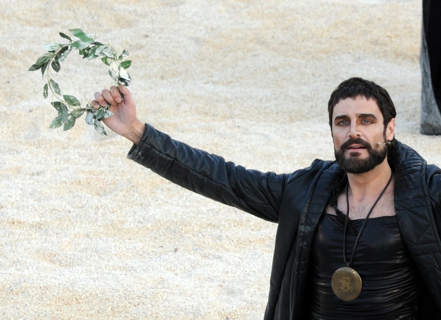 Questo, purtroppo, è quasi impossibile, dato che da qualche anno – si usano i microfoni e non si lascia alla sola voce degli attori il suono e la potenza delle parole. Perché, questo luogo unico al mondo, ha leggi proprie, che vanno rispettate anche nei vincoli che pone. Vincoli che sono anche stimoli per un regista. Detto questo, la suggestione di questo rito annuale vince su qualsiasi altra obiezione, persino sulla qualità o meno dello spettacolo rappresentato. Spettacolo riuscito, e accolto con successo, è l’Edipo re del regista Daniele Salvo. Il personaggio più emblematico nella tragedia greca che ignora la sua sorte in quello che viene considerato il primo giallo della letteratura e che il suo autore, Sofocle, destina ad indagare su se stesso, ignaro di essere investigatore e colpevole allo stesso tempo.