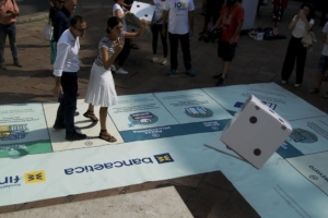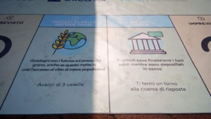 Intorno alla statua che, diciamo così, con un gesto conosciuto a livello internazionale “manda al diavolo” lo sporco mondo della speculazione, gli attivisti della finanza etica hanno riprodotto in grande il famoso gioco da tavola Monopoli rinominandolo Borsopoly come metodo per apprendere segreti e bugie del mondo dei soldi, per capire assieme come liberarsi dalla logica asfissiante di una disciplina che gioca con la vita reale delle persone ma resta accessibile alla conoscenza di pochissimi.