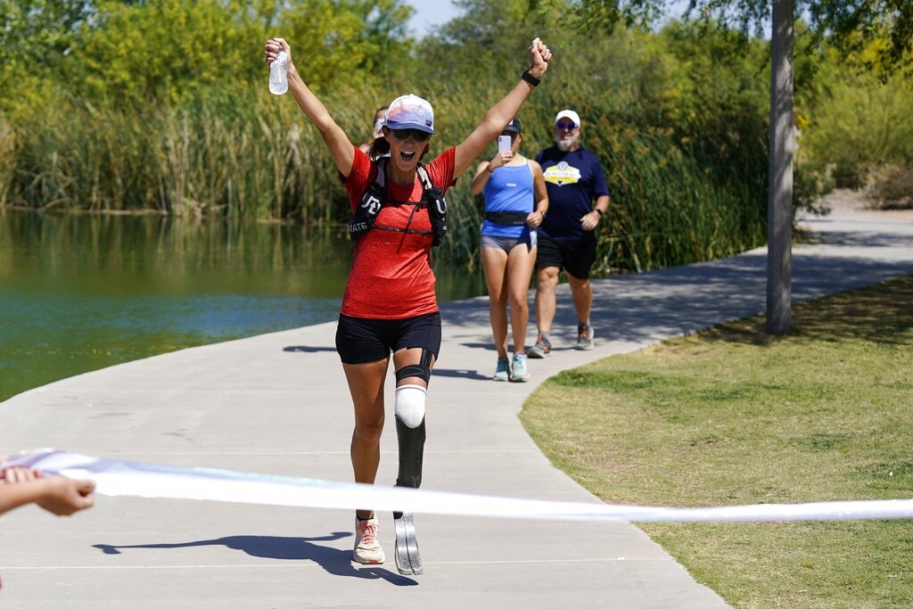 Nella foto, Jacky Hunt-Broersma termina la sua 102a maratona in 102 giorni, al Veterans Oasis Park di Chandler, Arizona, giovedì 28 aprile 2022. Foto: AP/Ross D. Franklin
