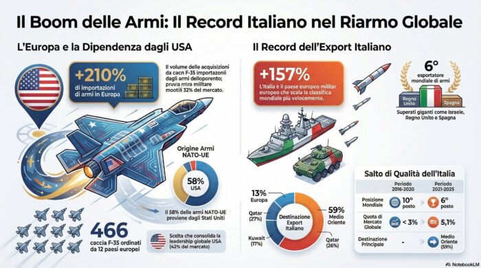 Come esplicitato da una nota della Rete italiana pace e disarmo, il dato centrale dell’autorevole report è che l’Europa è diventata il motore del riarmo globale. Mentre il volume mondiale dei trasferimenti di armi è cresciuto del 9,2%, in Europa le importazioni sono letteralmente triplicate (+210%). Per la prima volta dagli anni Sessanta, il nostro continente è la prima regione al mondo per acquisti militari.
