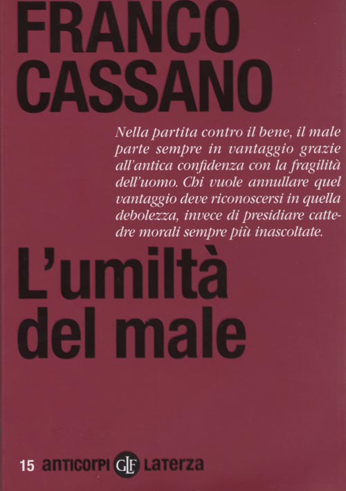 Per Cassano sarebbe l’umiltà del male il vero nemico da combattere, il male che s’insinua dovunque, soprattutto nell’alterigia di chi si pone in qualche modo tra gli eletti, in una gnosi altezzosa che impedisce di fare i conti con la debolezza dell’uomo. Anzi, la posizione superiore degli eletti sarebbe una delle cause più profonde del trionfo del male.