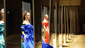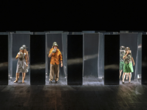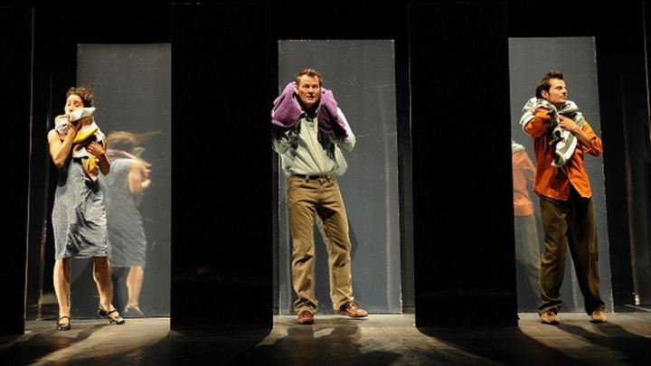 I 9 magnifici interpreti – alcuni veterani della Compagnia di Marin – entrano ed escono da dietro dei pannelli flessibili e specchianti scalati su due file, muovendosi l’uno accanto all’altro simultaneamente. Camminano, si sfiorano, si rincorrono, indossano gli stessi abiti, si cambiano, eseguono gli stessi gesti duplicandosi o moltiplicandosi. C’è chi gusta una mela, chi mangia carote tenendo in testa lunghe orecchie da coniglio, e chi rosicchia delle ossa; chi indossa una corona di cartone e chi corna di cervo; chi compare con le manette ai polsi e chi vaga con una torcia; chi porta sulle spalle dei sacchi o dei quarti di bue da macellare, e chi tiene dei mitra in mano; chi ha ali di farfalla e chi una parrucca. Una coppia si bacia e un’altra litiga; una donna si lancia al collo di un uomo nel tentativo di farsi sorreggere. Ogni tanto c’è chi corre smarrito e chi insegue invano qualcuno. E si potrebbe continuare a descrivere all’infinito aggiungendo che nelle stesse azioni ripetute e da sincronismo perfetto, s’inseriscono cambi di costumi e l’aggiunta di accessori.