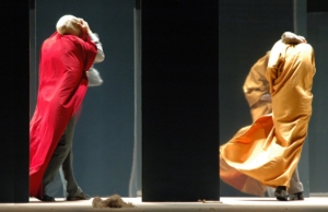 Sono in balìa di un vento incessante (presagio di un’apocalisse?) dal rumore frastornante, che si placherà solo per qualche attimo, per riprendere minaccioso, sospingendoli e ostacolandoli nel frenetico andirivieni. A interrompere però questo flusso è l’improvviso fermarsi, a più riprese, di una sola figura – in alcuni momenti sono due o tre –, la quale, immobile, ci guarda severa, per qualche istante, complici le luci rivolte appena in platea. Ci interpella, ci sfida, forse chiede aiuto, o forse ci giudica.