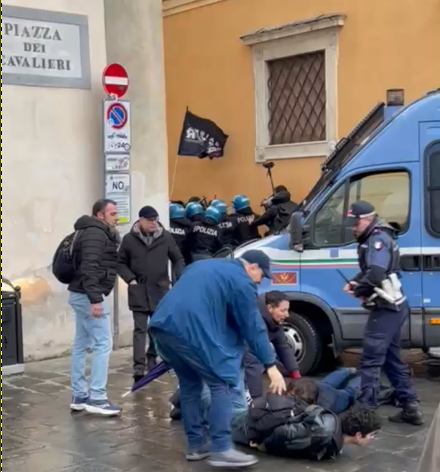 Volevano raggiungere piazza dei Cavalieri, dove si trova la Scuola Normale superiore, lontani da obiettivi sensibili come la sinagoga. Ma gli studenti, con gli zainetti sulle spalle e senza armi, sono stati bloccati da entrambi i lati di via San Frediano, una strada senza uscite e, nonostante le braccia alzate, sono stati caricati a colpi di manganello. Tra i manifestanti c’erano anche dei docenti.