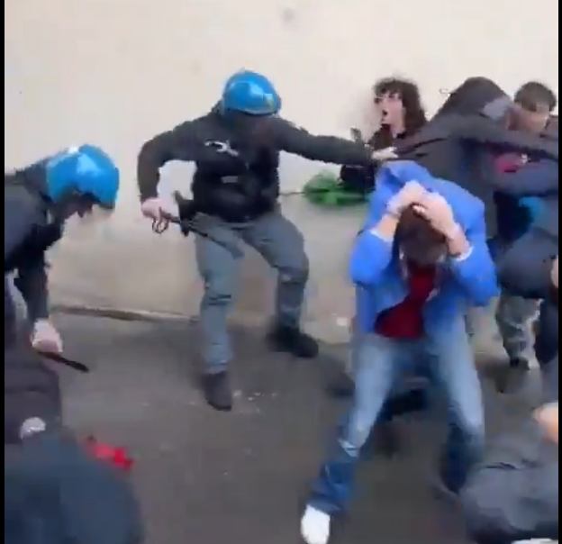 «Potrebbero essere i vostri figlioli, hanno 15 anni – ha gridato un professore –. Non sono terroristi!». «Sono ragazzi. Non sanno nulla. E comunque noi – ha detto un’insegnante – siamo pubblici ufficiali come voi e stiamo riprendendo tutto ciò che succede». Anche visionando decine di filmati, da diverse angolazioni (i social ne sono pieni, tutti possono verificare da soli) non si vede nessun ragazzino – perché parliamo di adolescenti – colpire i poliziotti, che invece li hanno manganellati con violenza anche quando erano a terra.