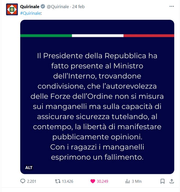«Il Presidente della Repubblica ha fatto presente al Ministro dell’Interno, trovandone condivisione, che l’autorevolezza delle Forze dell’Ordine non si misura sui manganelli ma sulla capacità di assicurare sicurezza tutelando, al contempo, la libertà di manifestare pubblicamente opinioni. Con i ragazzi i manganelli esprimono un fallimento». Il fermo richiamo del Quirinale è arrivato il 24 febbraio, all’indomani degli incresciosi fatti di Pisa e Firenze, dove decine di studenti sono stati manganellati dalla polizia mentre manifestavano pacificamente chiedendo il cessate il fuoco in Palestina, dove continuano i bombardamenti di Israele.