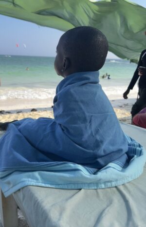 Quest’anno Alessandra era da loro e hanno fatto una giornata al mare. Loro vivono a soli 40 minuti di macchina di distanza, ma alcuni dei bambini il mare non l’avevano mai visto. Forse per questo è riuscita ad immortalare una scena insolita: il più piccolo, dopo aver fatto il bagno, si è seduto su uno sdraio e, durante un’ora e mezza, non ha mai smesso di guardare il mare.