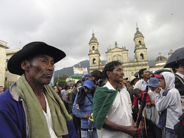 Non bastano più le minga, grandi marce e manifestazioni pubbliche degli indigeni – qui nella foto a Bogotà, dinanzi alla cattedrale – per sensibilizzare l’opinione pubblica. Serve ormai una mobilitazione internazionale.