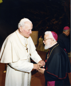 Monsignor Toppi con San Giovanni Paolo II. Foto dell’archivio fotografico del santuario di Pompei.