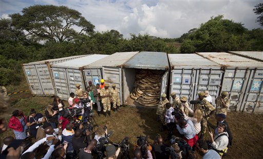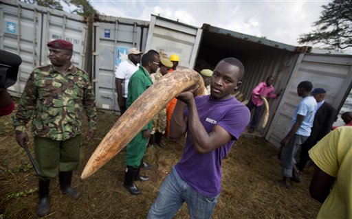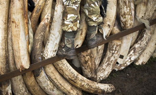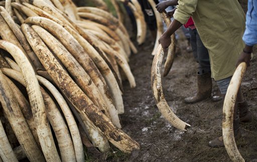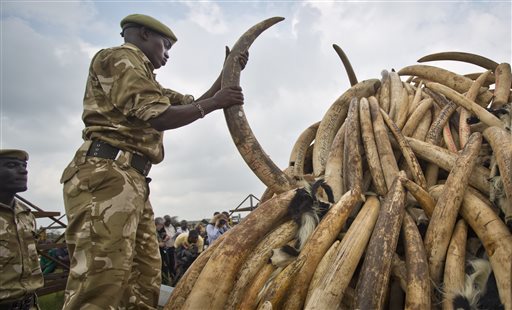 Le guardie forestali del Kenya impilano zanne di elefante dopo averle scaricate dai container provenienti da tutto il Paese, nel Parco nazionale di Nairobi. Circa 105 tonnellate di avorio e di altri prodotti di origine animale in via di estinzione saranno bruciati la settimana prossima, il 30 aprile, anche alla presenza di personaggi famosi a livello internazionale, da Nicole Kidman ad Angelina Jolie, e molti altri ancora. Secondo il Kenya Guardlife Service sarà la più grande distruzione d'avorio mai avvenuta nella storia e coinciderà col meeting dei Giants Club per la protezione degli elefanti che si terrà in Kenya. (foto Ap)