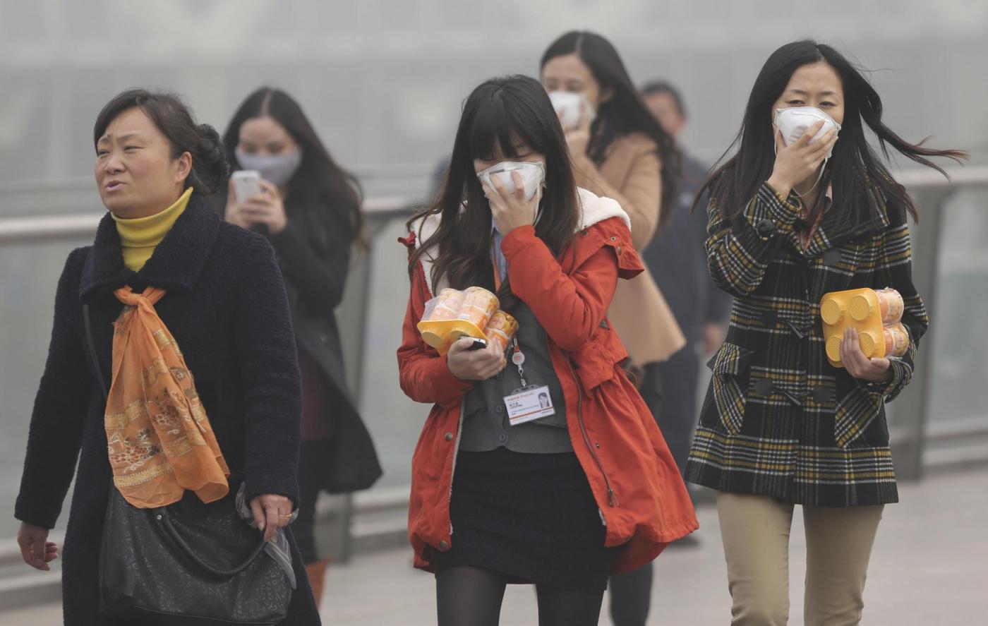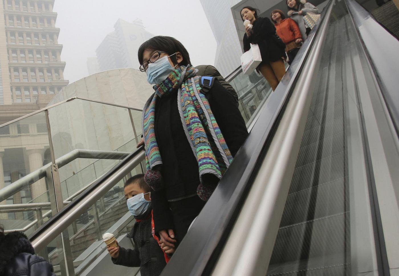 Le autorità di Shanghai hanno decretato la chiusura delle scuole a causa dell'elevato livello di inquinamento atmosferico registrato nella metropoli cinese, che ha oscurato il cielo, costringendo i cittadini a girare per le strade con le mascherine di protezione (foto LaPresse).
