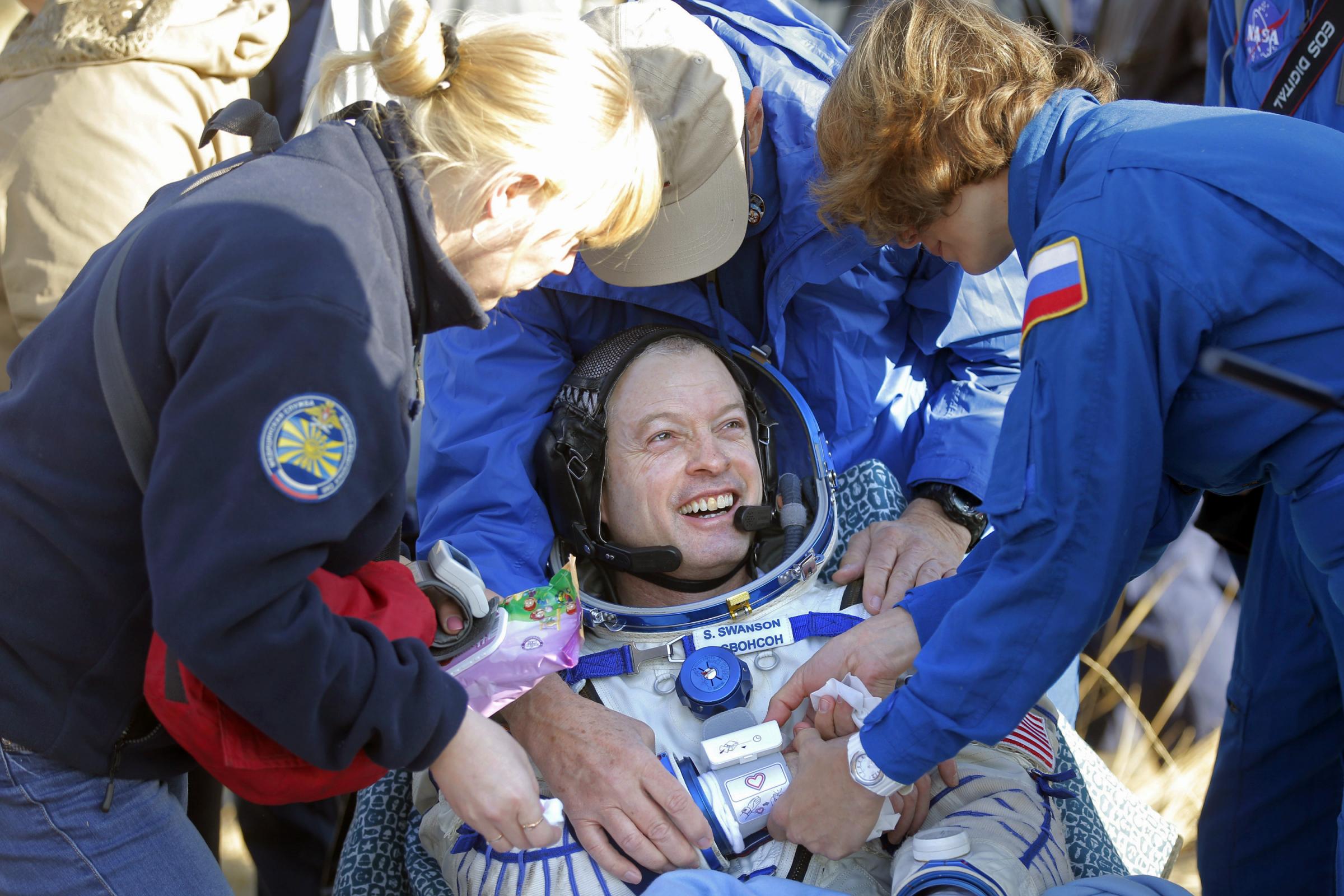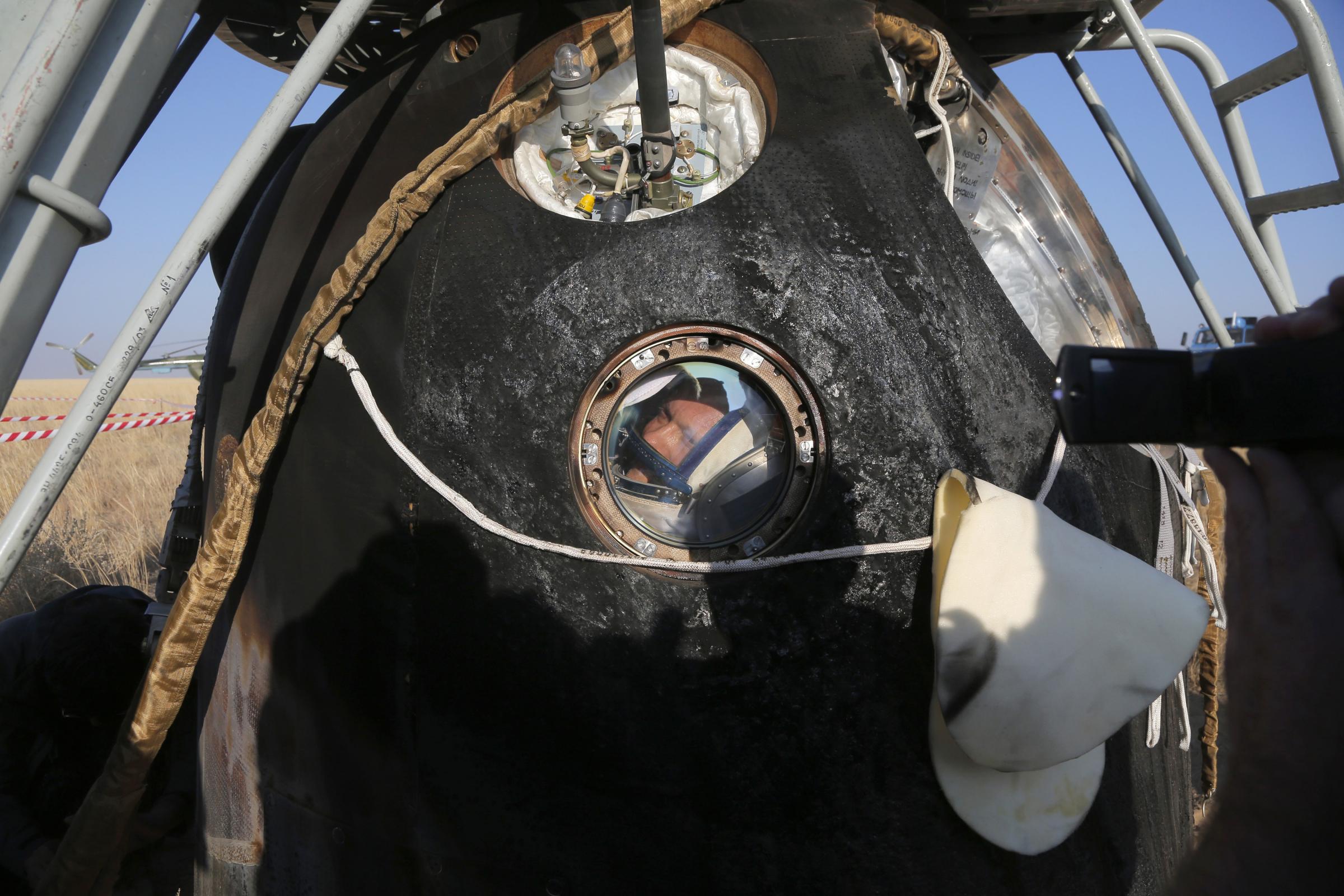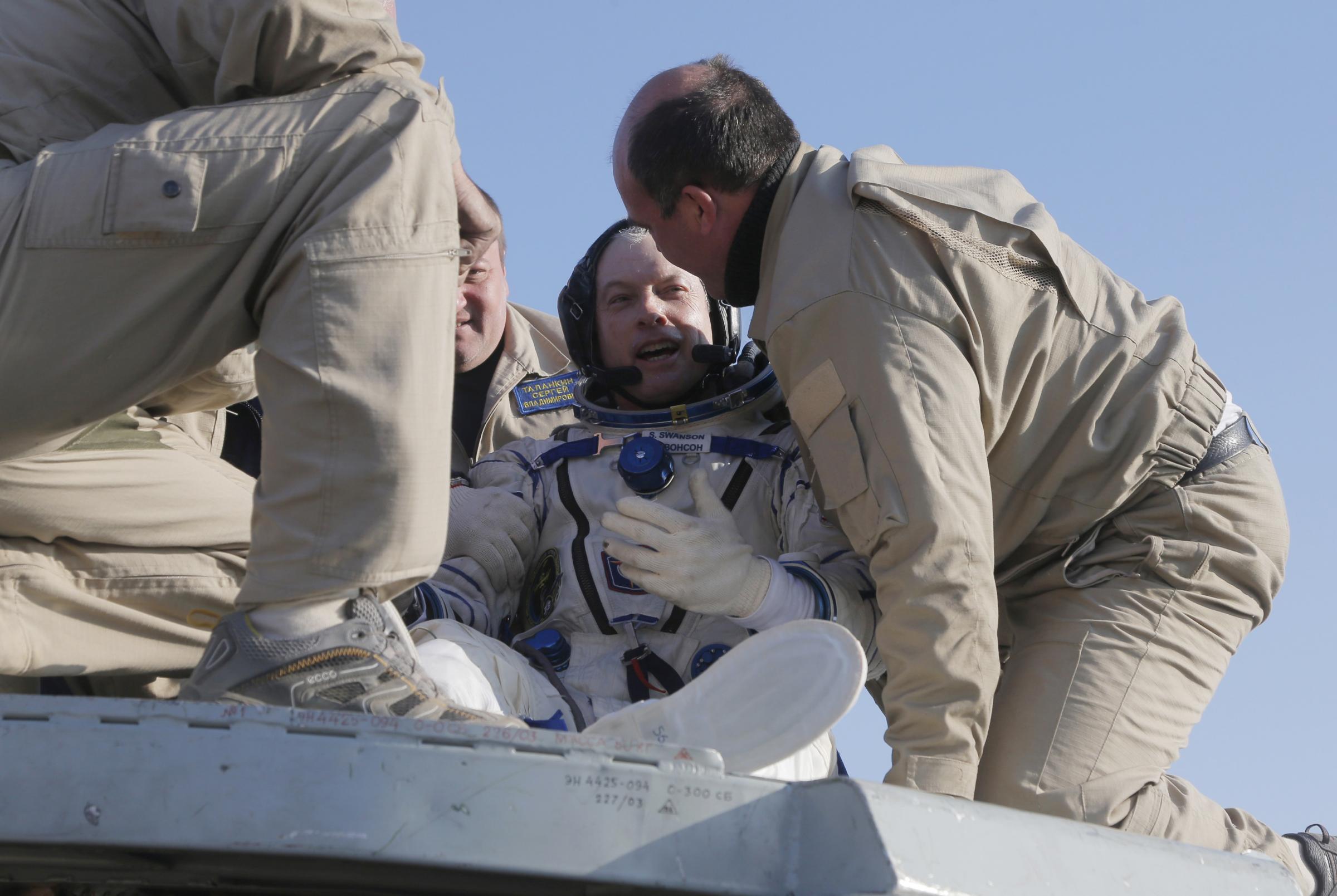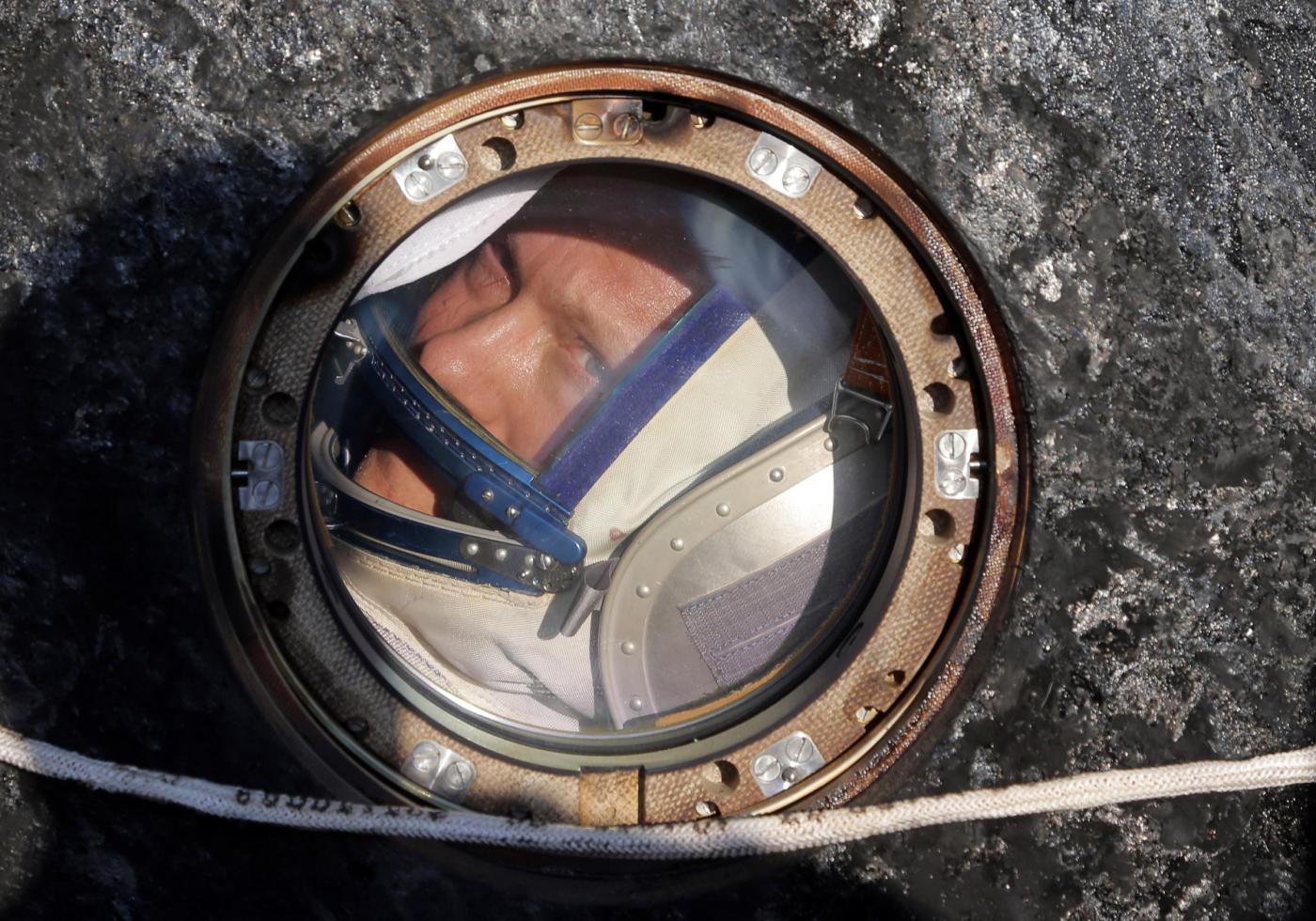 Tre astronauti, due russi e un americano, Alexander Skvortsov, Oleg Artemyevsono e Steve Swanson, sono atterrati con la navicella Soyuz ieri mattina nelle steppe del Kazakistan dopo la spedizione a bordo della Stazione spaziale internazionale durata 167 giorni (foto Lapresse).