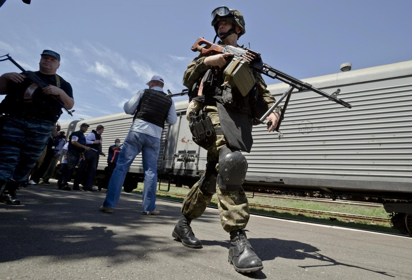 Dopo essere partito da Torez, il treno frigo con le vittime dell'aereo abbattuto nei giorni scorsi è arrivato stamattina a Kharkiv, in Ucraina. Secondo le ultime indagini, il velivolo sarebbe stato colpito da un missile. In un rimpallo di accuse tra ucraini e filorussi, sono ancora da accertare le responsabilità del disastro (foto Ap/LaPresse).