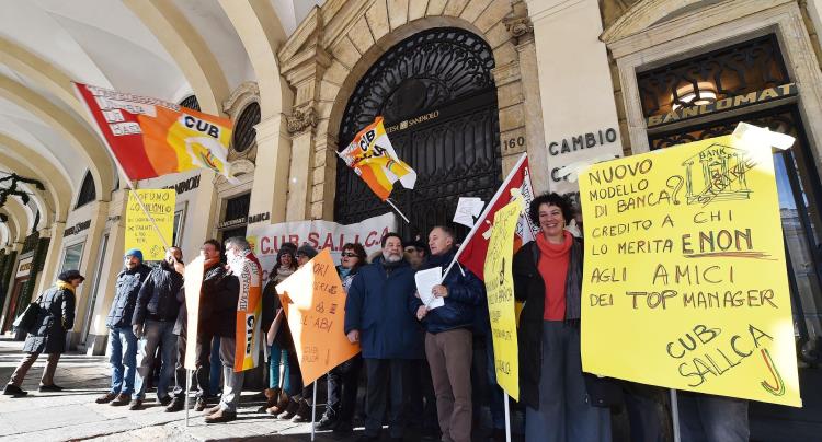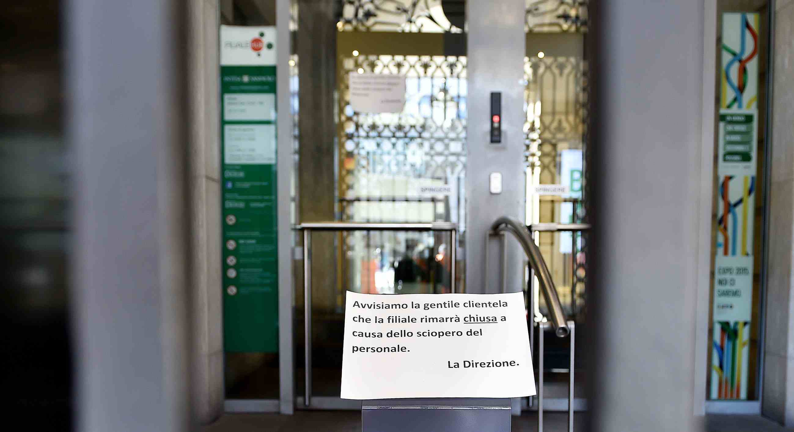 Sciopero dei bancari, oggi, in tutta Italia. i lavoratori degli istituti di credito protestano per chiedere di avere una parte attiva nel rinnovo del contratto, dopo la rottura delle trattative avvenuta lo scorso novembre (foto Ansa).
