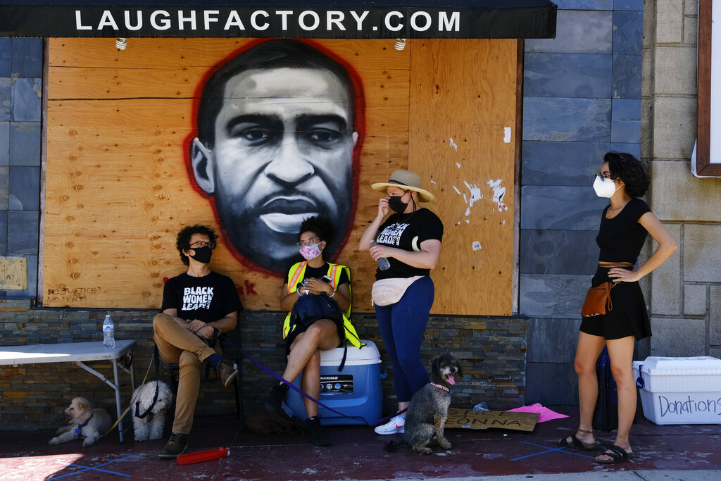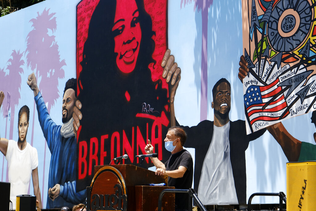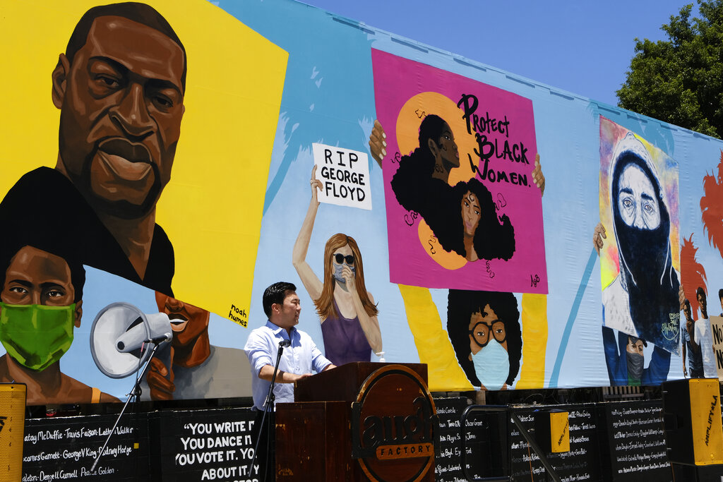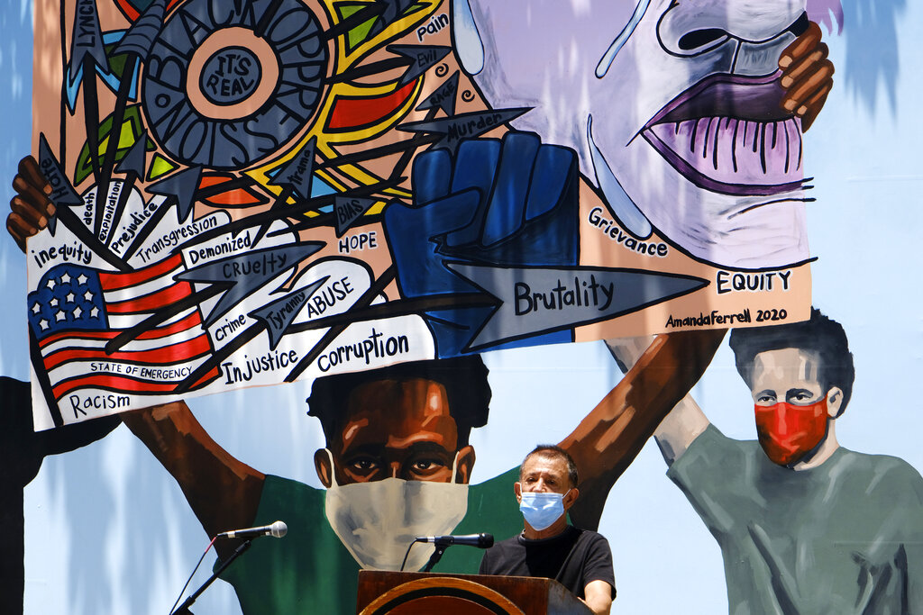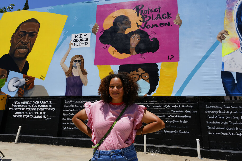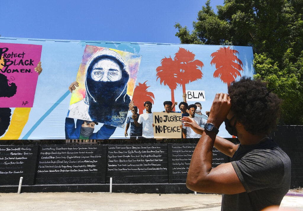 Come contributo alla campagna, in corso negli Usa, contro la violenza ai danni delle persone di colore (Black lives matter – le vite delle persone di colore sono importanti), a Los Angeles è stato creato un murales lungo 148 piedi (il più grande della nazione). L’opera è stata ideata da cinque artisti afroamericani: Alexandra Allie Belisle, Amanda Ferrell Hale, Noah Humes, PeQue Brown e Shplinton. Il murales è un modo efficace per gli artisti neri di presentare in modo pubblico le sfide della società odierna dal loro punto di vista (AP Photo / Richard Vogel)