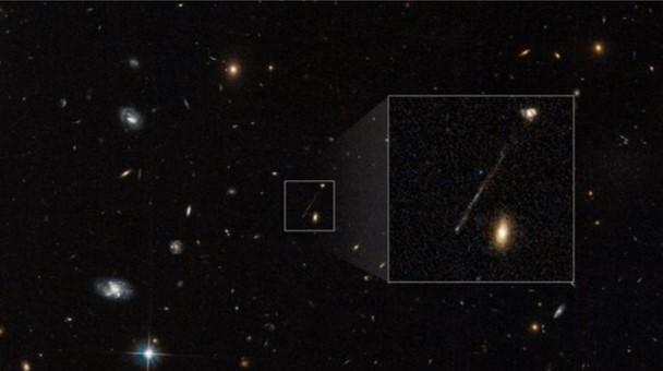 La debole scia di stelle blu, che rivela il buco nero in fuga, è stata scoperta per caso. È la prima volta che si osserva qualcosa di simile. L’universo non cessa di stupirci e affascinarci.
