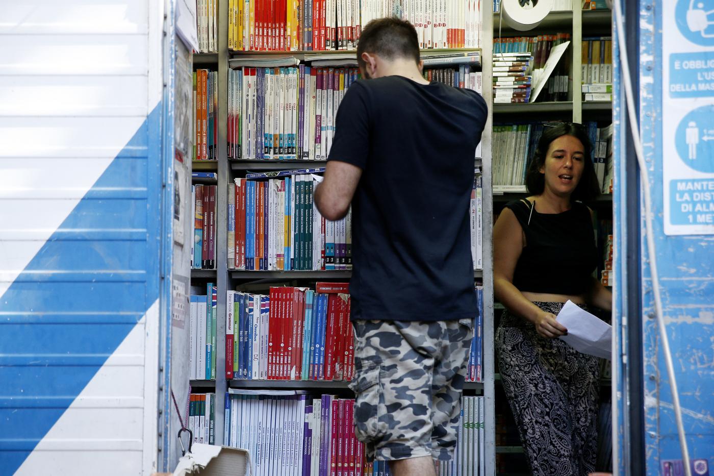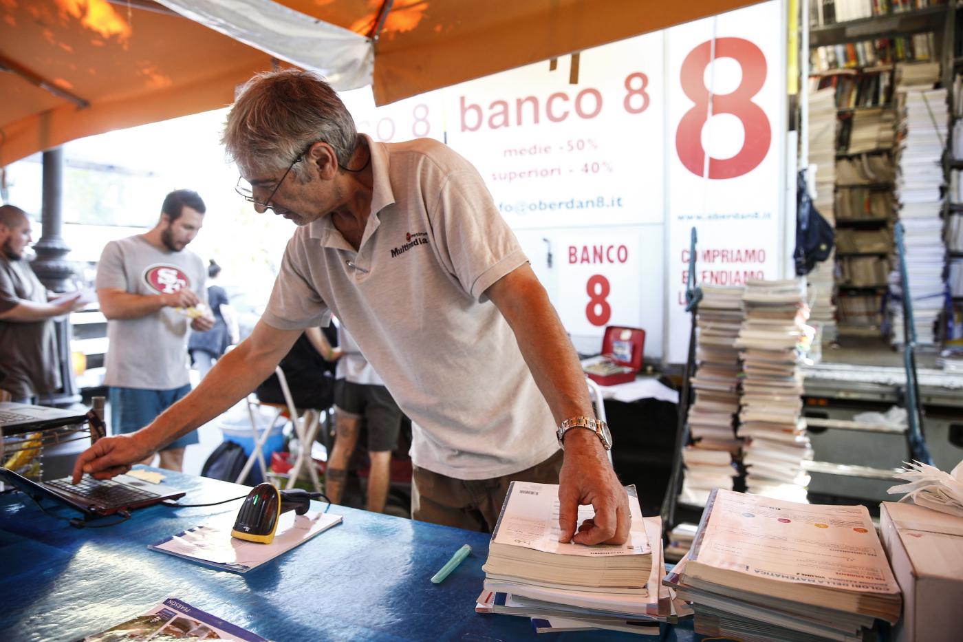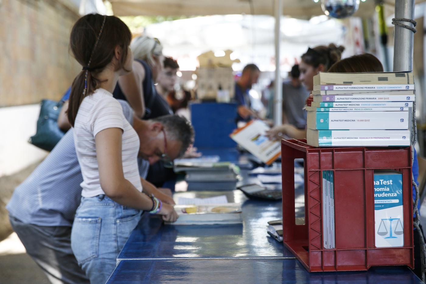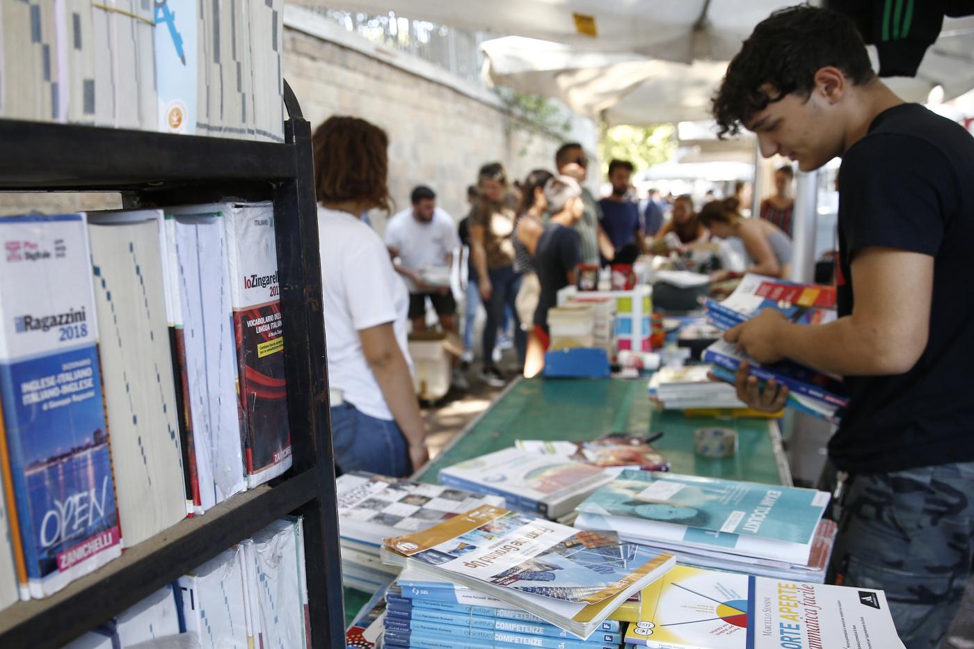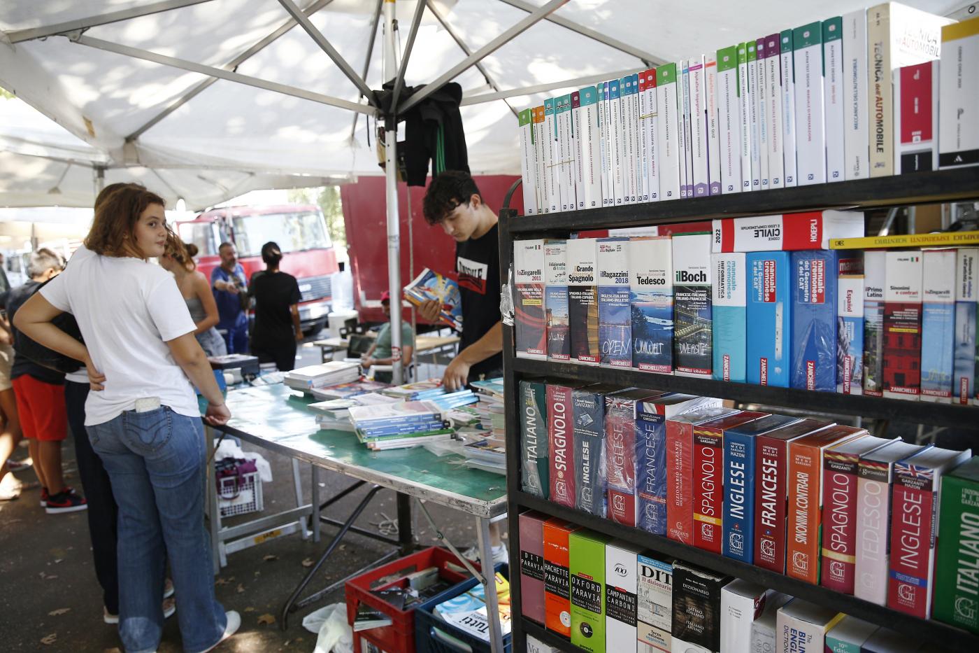 Nonostante il quasi raddoppio del prezzo della carta, il prezzo dei libri, secondo l’Associazione italiana editori, è stato fissato a inizio anno e quindi non può variare. Gli editori scolastici mantengono l’aumento dell’1,5% (che può rivelarsi importante per i nuclei familiari con più di un figlio in età scolare): “Questo – sottolinea l’Aie – dimostra il senso di responsabilità degli editori. In questo clima di difficoltà complessiva, siamo impegnati a garantire a tutti i libri per iniziare l’anno scolastico”. I rincari riguardano soprattutto quaderni, diari e gli articoli di cartoleria e materiali da disegno che segnano un rialzo del 6,5%. La spesa complessiva per gli studenti delle scuole medie è una media di 400 euro ad alunno per i libri nuovi; alle superiori sale a 450 euro. Nelle foto la folla al mercatino di libri usati sul Lungotevere Oberdan a Roma. (foto Lapresse)