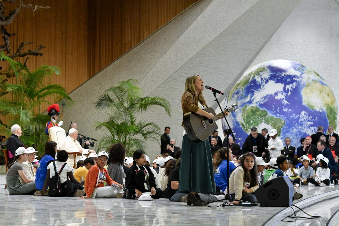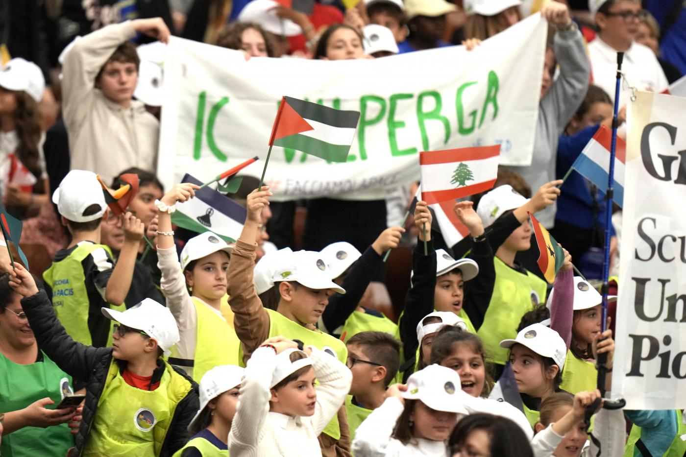 Hai fatto una domanda che tocca anche la tua terra che soffre tanto, in questo momento. Se scoppia la guerra: la guerra è già scoppiata, cari. Sentite questo: la guerra è scoppiata in tutto il mondo. Non solo in Palestina: è scoppiata nel Sud dell’Africa, è scoppiata nel Congo, è scoppiata nel Myanmar, è scoppiata in tutto il mondo. Sono guerre nascoste, in Mozambico… in tutto il mondo. Noi stiamo vivendo una guerra brutta e la guerra ci toglie la pace e ci toglie la vita. Dobbiamo pensare un po’, lavorare per la pace. Lo diciamo insieme, a bassa voce: “lavoriamo per la pace”. Tutti! [ripetono]. E questa ragazza, che si chiama Rania, la sua patria è in guerra e si soffre tanto. Facciamo una cosa: in silenzio, facciamo un saluto a Rania e a tutta la gente della sua patria. E tu fai sapere alla gente di Palestina che tutti i bambini hanno salutato. La pace è bella. Tutti: “la pace è bella” [ripetono] Grazie, Rania.