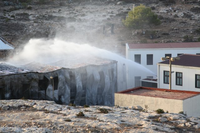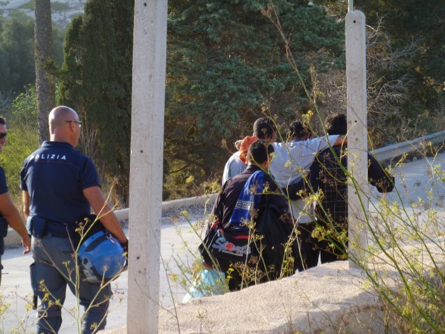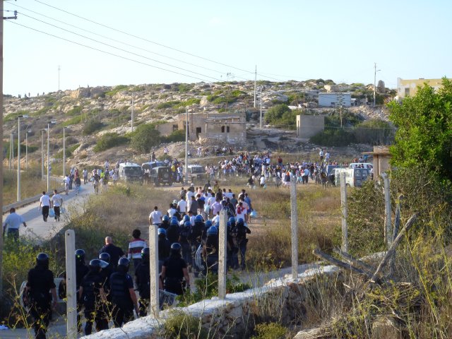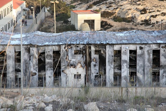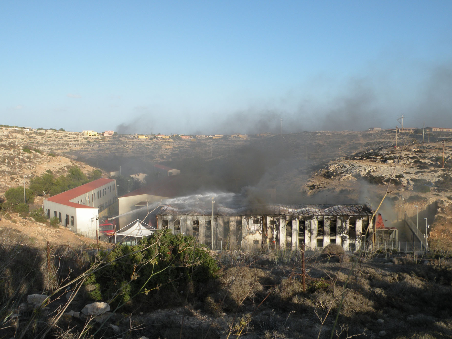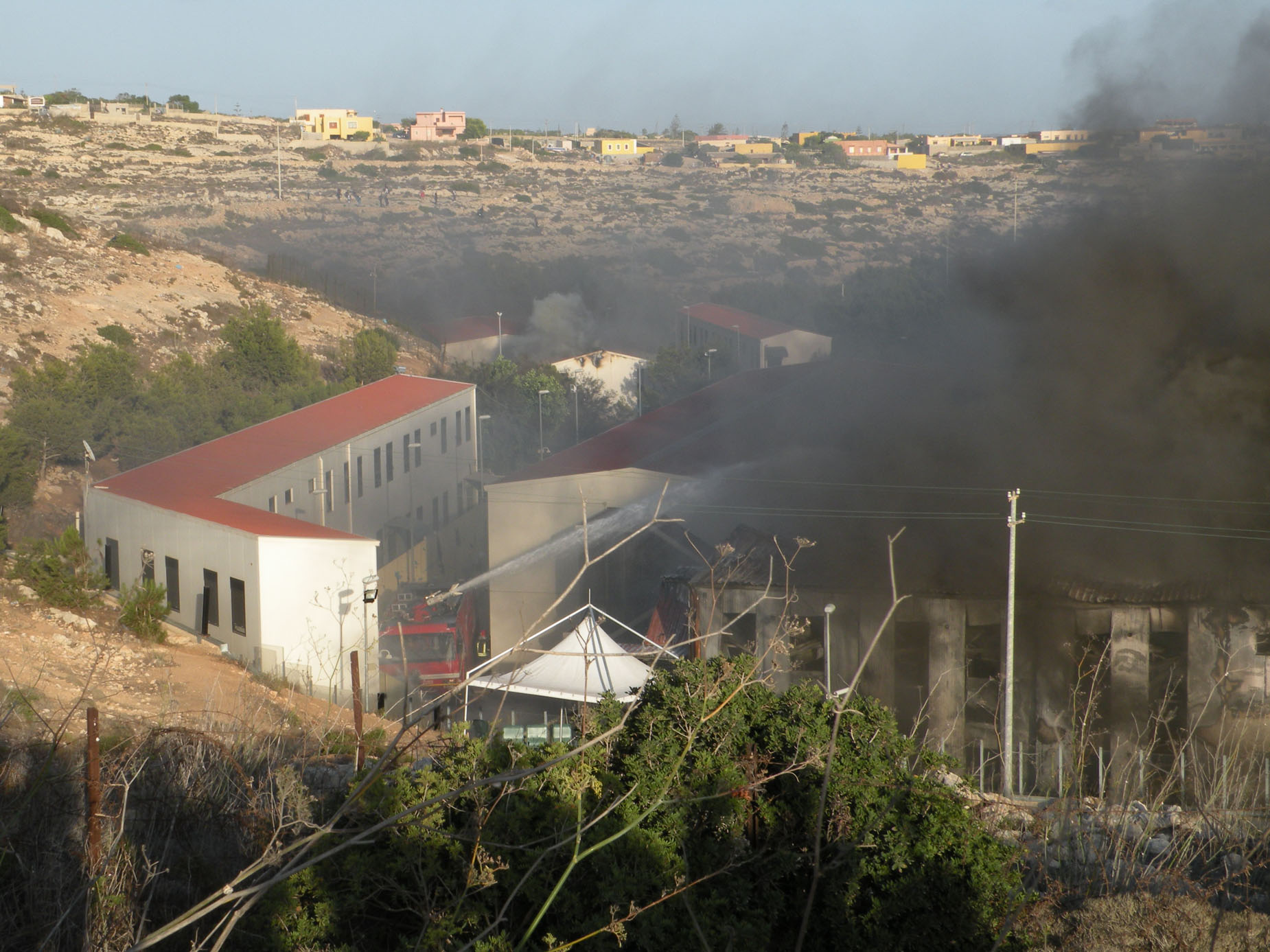 A fuoco i capannoni degli alloggi, mentre gli immigrati scortati dagli agenti si allontanano da contrada Imbriacola. Dalla nostra corrispondente