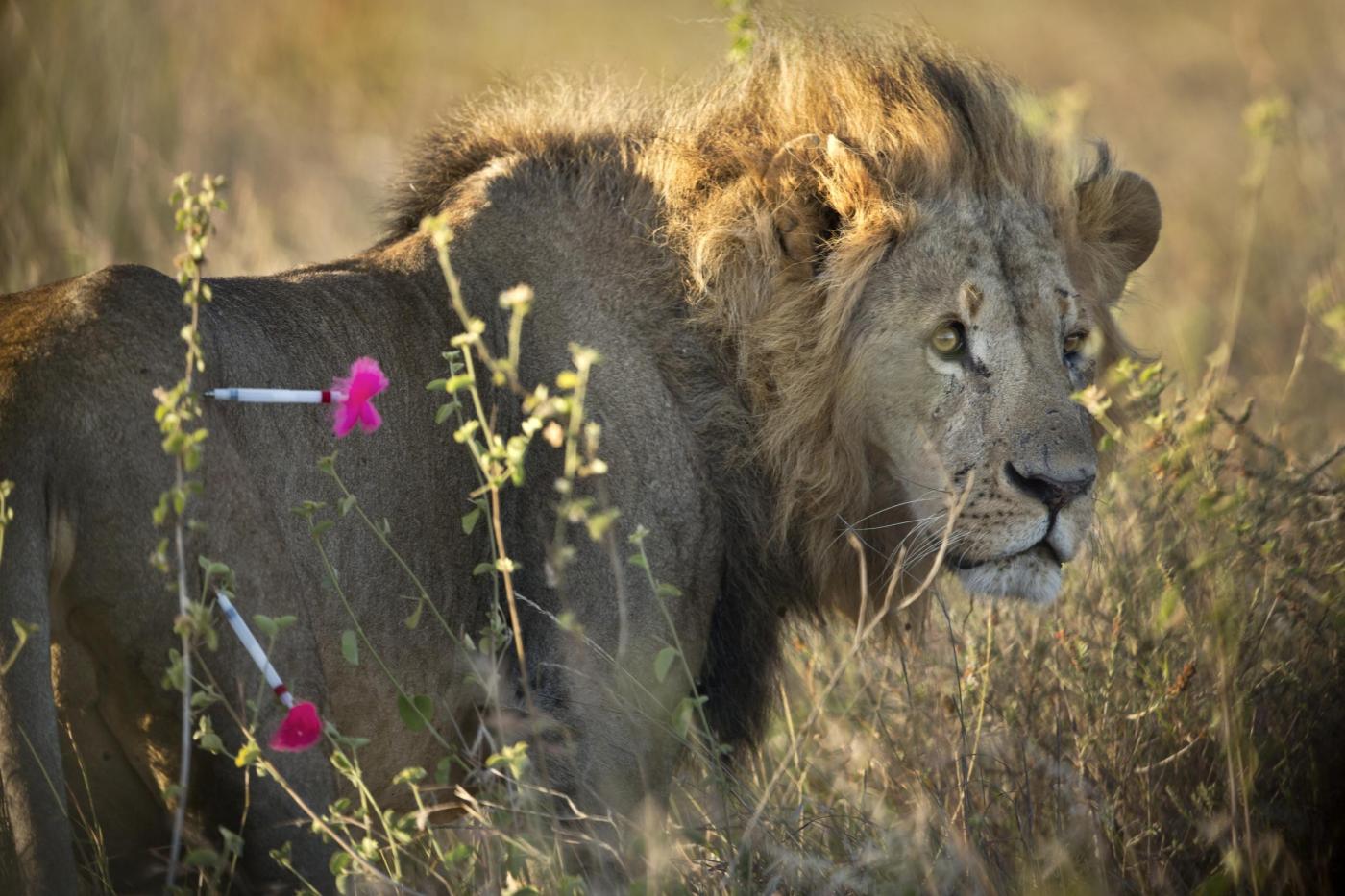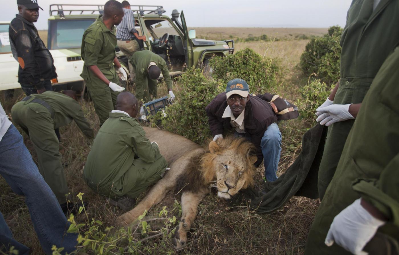 Il Nairobi National Park è a pochi chilometri dal centro della capitale del Kenya. Qui i leoni scorazzano e vivono, ma spesso escono dai limiti della zona protetta e sconfinano nelle aree adiacenti, entrando in conflitto con la popolazione. Gli addetti alla sicurezza del parco anestetizzano un leone per applicare un collare gps che renderà tracciabili gli spostamenti (foto LaPresse).