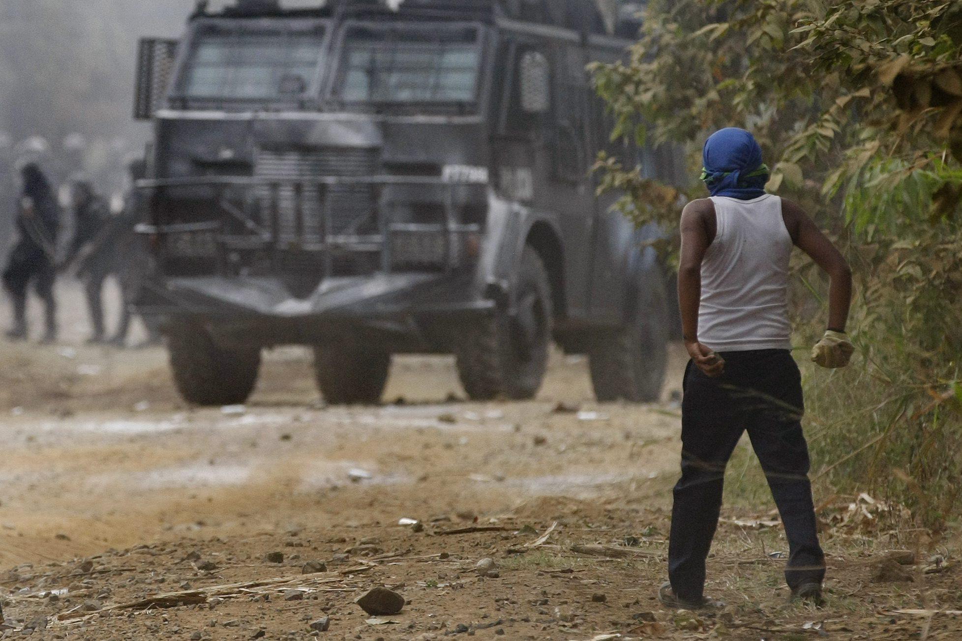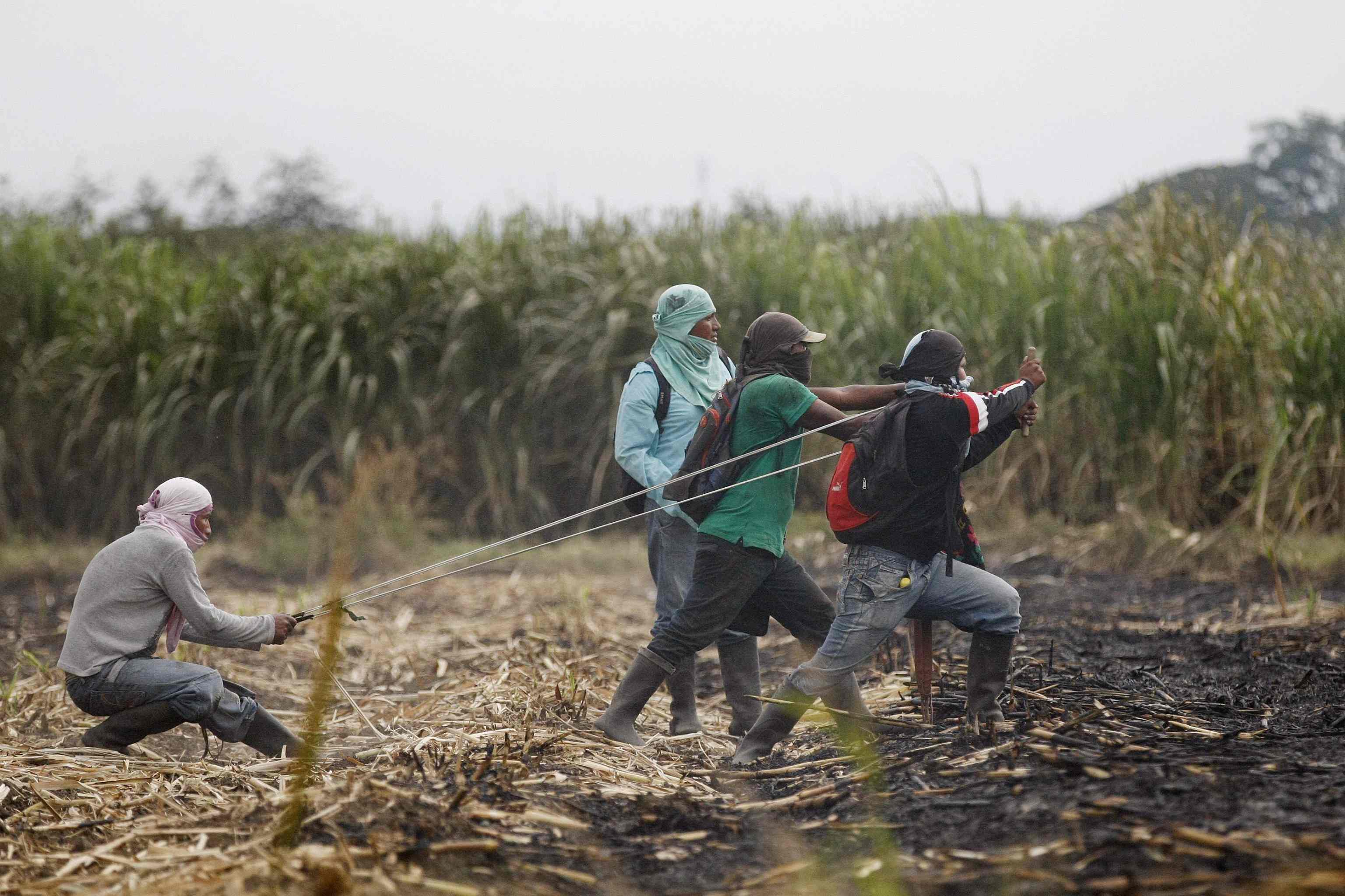 La popolazione rurale protesta contro i grandi appezzamenti in cui si coltiva canna da zucchero. La Valle del Cauca, regione meridionale della Colombia, è dominata dalla monocoltura della canna da zucchero, che rappresenta una delle industrie agricole più redditizie per il Paese e che sta scalzando i piccoli produttori dalle loro terre, costringendoli a lavorare nei latifondi in condizioni durissime (Ansa Foto).