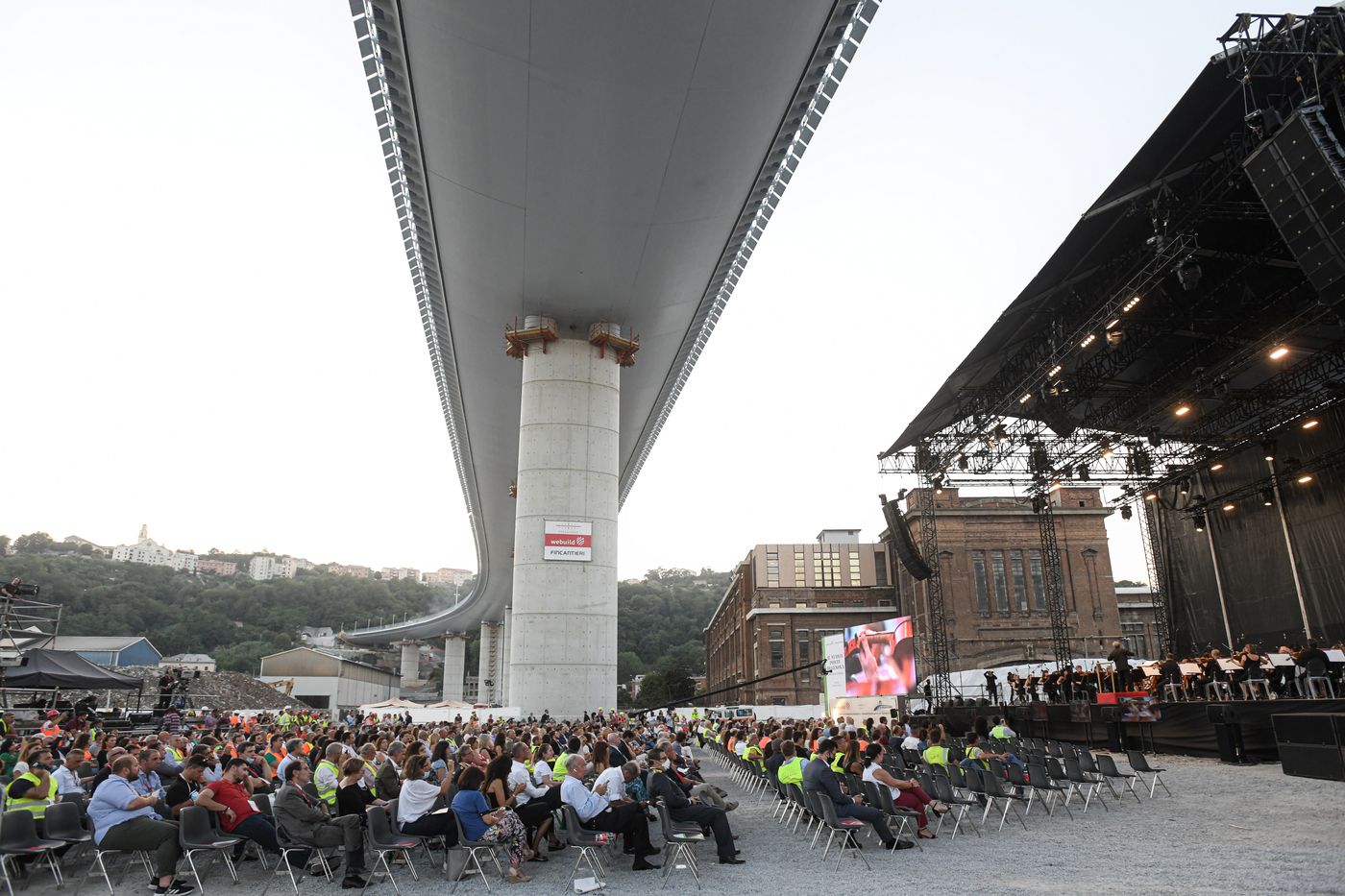 «Questo ponte – ha detto Renzo Piano prima del concerto – attraversa silenziosamente le due vallate. Ora che è finito si vede che è sobrio, parsimonioso, semplice e forte. È genovese in questo, così come è genovese perché gioca con la luce, perché ricorda un bianco vascello da cui si scopre il mare. Io ho messo solo l’idea, questo ponte è merito delle 1.184 persone che ci hanno lavorato».