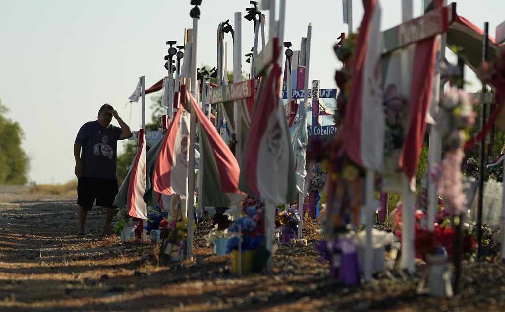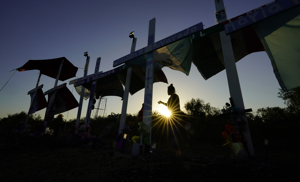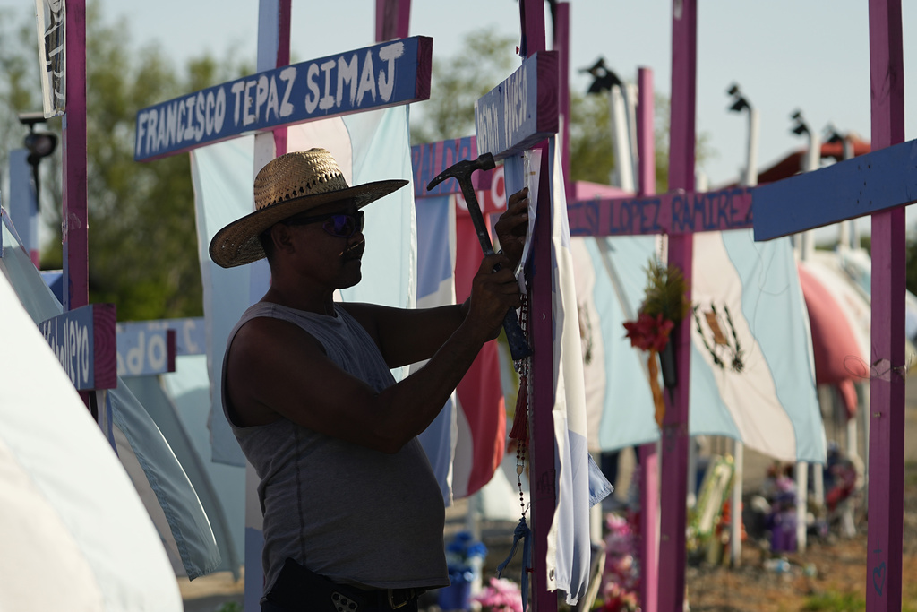 Un cimitero improvvisato, 53 croci con lettere e poesie per ricordare le dozzine di corpi trovati morti la scorsa estate all’interno di un rimorchio abbandonato a San Antonio, in Texas. 53 migranti tra cui 8 bambini lasciati morire in un rimorchio da trattore dopo aver attraversato clandestinamente il confine tra Messico e Stati Uniti: dove cercavano vita hanno trovato la morte, anche a causa delle temperature torride dell’estate texana. Negli ultimi decenni migliaia di persone sono morte nel tentativo di emigrare negli States dal Messico e quest’ultimo ritrovamento si rivela la peggior carneficina dopo quelle del 2003 e del 2017. Le autorità statunitensi hanno annunciato l’arresto di altre quattro persone per morte per contrabbando di migranti in relazione a questa tragica vicenda. (Foto AP/Eric Gay)