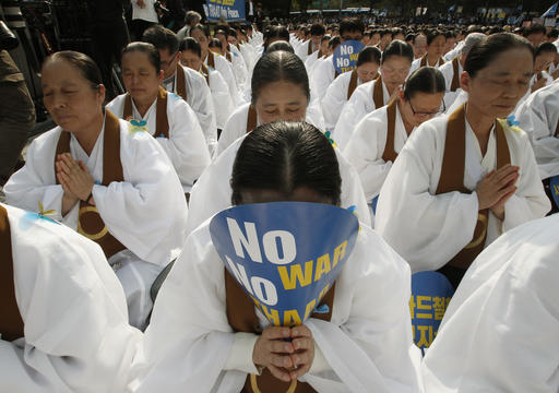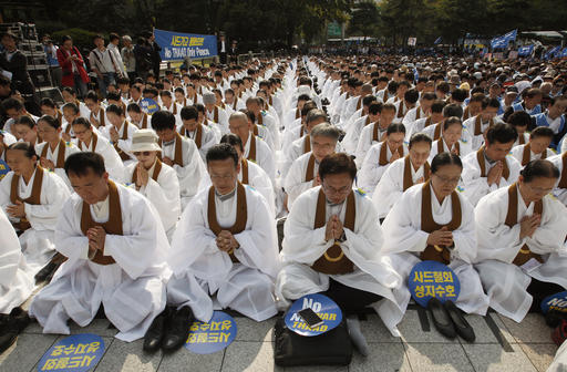 Monaci appartenenti al Buddismo Won sudcoreano e cittadini pregano durante una manifestazione contro il piano per l’istallazione di un sistema di difesa missilistica fornito dagli Stati Uniti (THAAD) a Seoul. L’avanzato sistema di difesa dovrebbe essere operativo entro la fine del prossimo anno, per far fronte alle minacce della Corea del Nord.