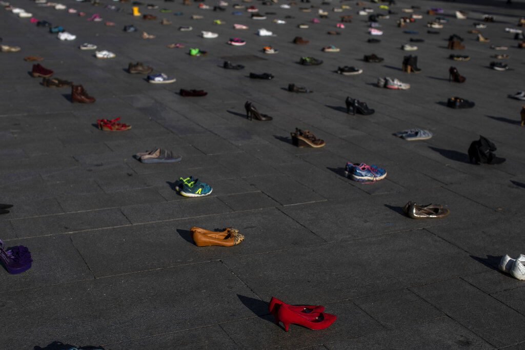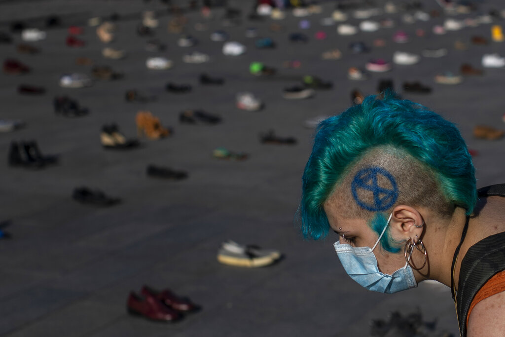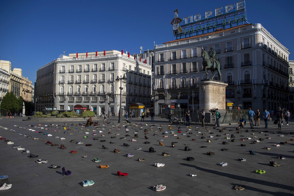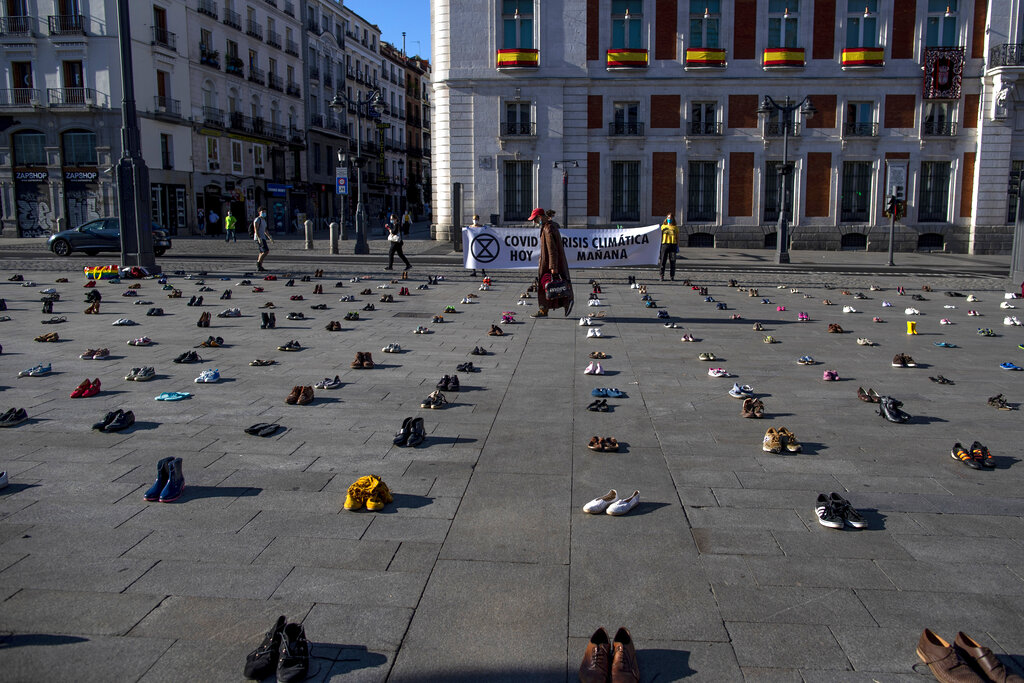 Mentre si combatte la battaglia planetaria contro il Coronavirus, gruppi di attivisti continuano a tenere alta l’attenzione contro i pericoli causati dal riscaldamento del pianeta. Riscaldamento che non aspetta, e avanza in maniera apparentemente inesorabile. Nelle foto: scarpe in piazza del Sol, nel centro di Madrid (Spagna). È la protesta del gruppo Members of Extinction Rebellion “Covid oggi, crisi climatica domani” contro l’inerzia dei governi.