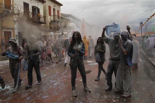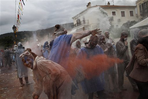 Nella città portuale di Galaxidi, in Grecia, la quaresima ortodossa ha inizio con un guerra a manciate di farina colorata che i passanti si lanciano colorandosi o meglio sporcandosi a vicenda. Il "clean monday", così si chiama la festa che raduna oltre 200mila persone da tutto il Paese. Con questa tradizione si da addio al Carnevale assieme al lancio di aquiloni, che spopola in altre città greche