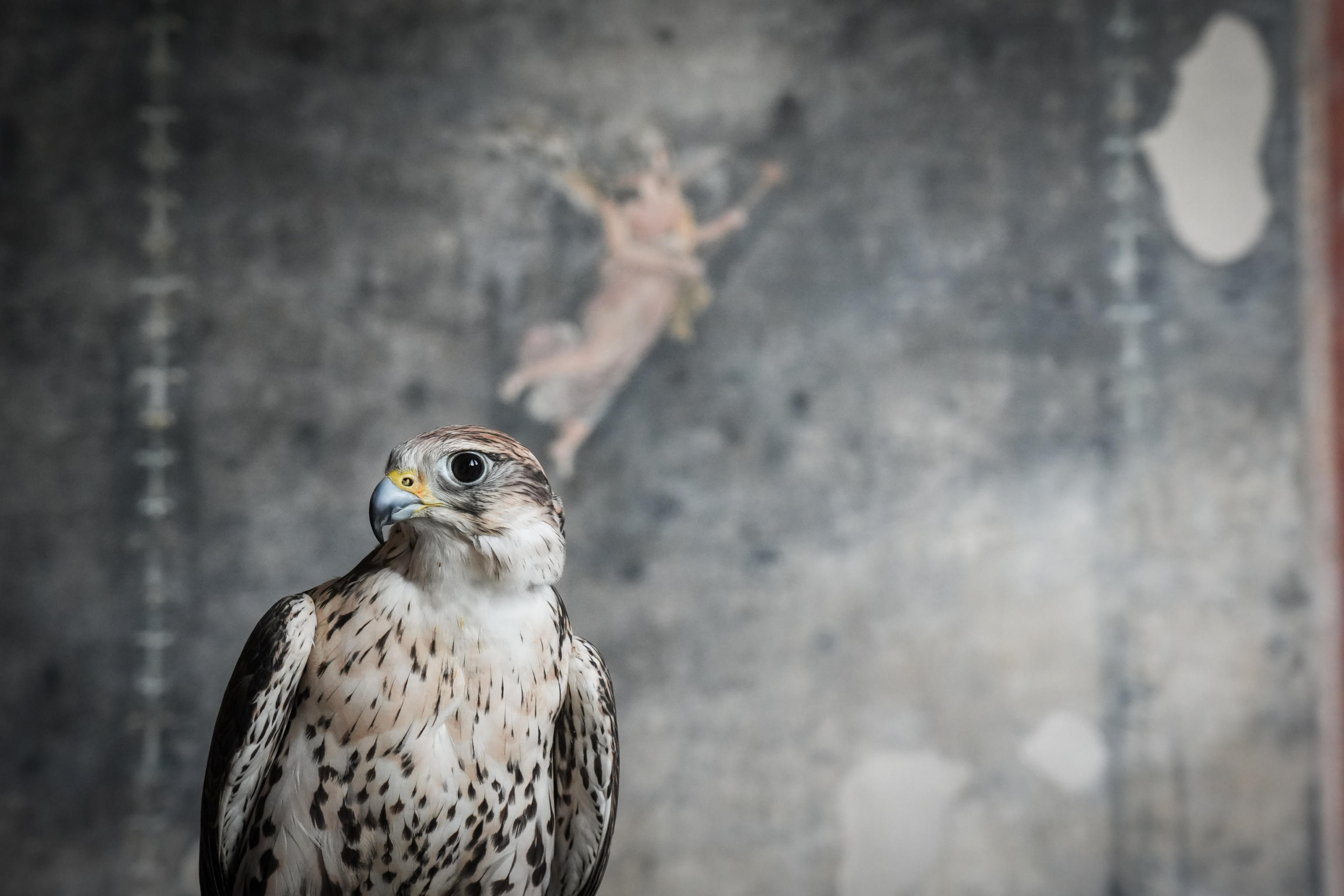 Il falco Aria e la poiana Gianna sono due rapaci addestrati per simulare la caccia dei piccioni, il cui guano acido e corrosivo mette a rischio l’integrità del Parco Archeologico e dei suoi affreschi.