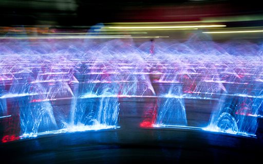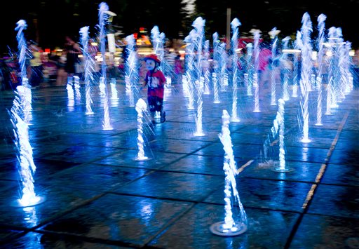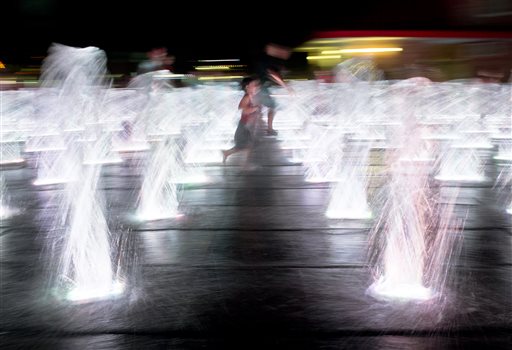 L'ondata di caldo che ha investito la Romania, ha reso le fontane di Bucarest luoghi di ristoro per bimbi e adulti che corrono a bagnarsi sotto le luci della notte, creando notevoli effetti artistici