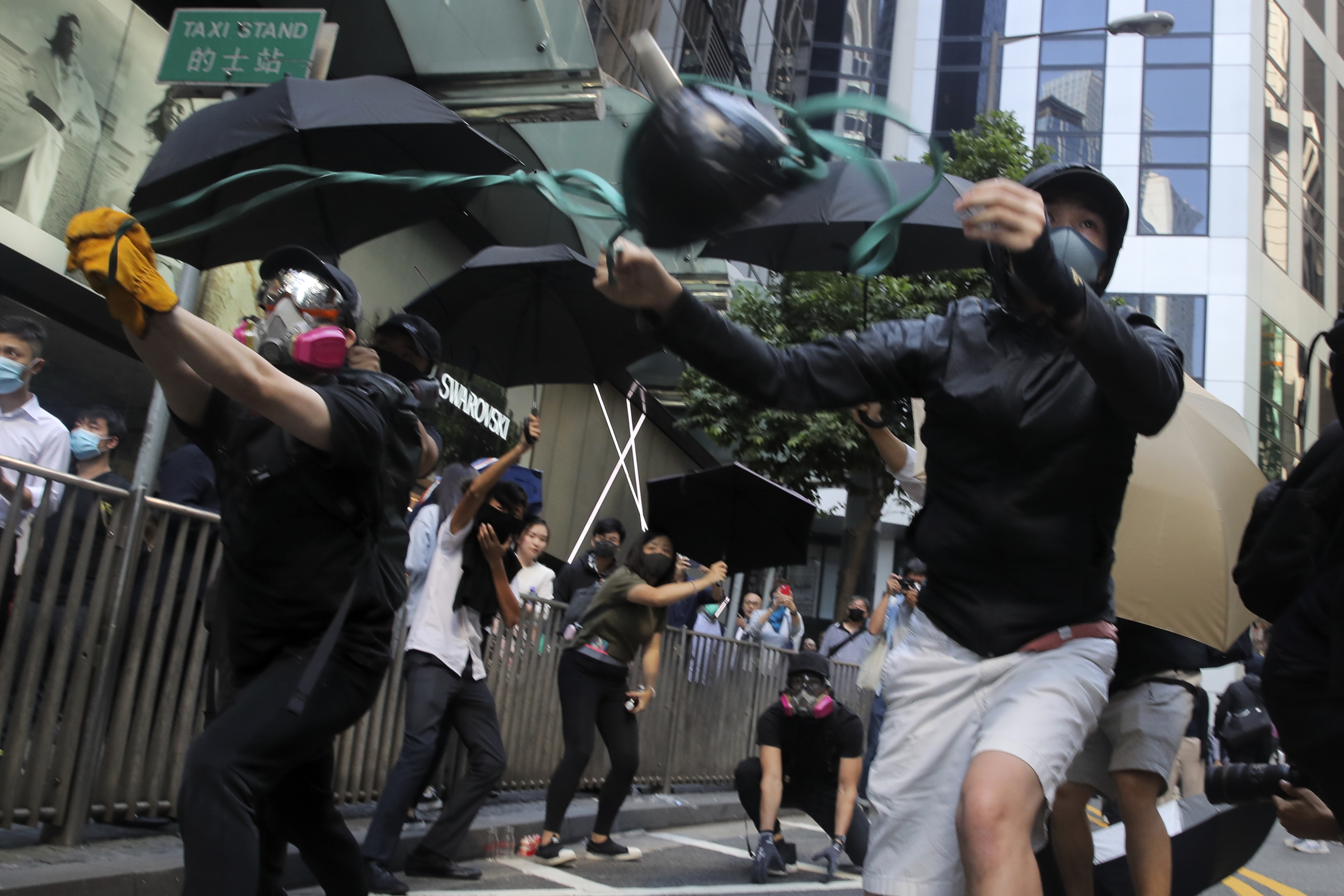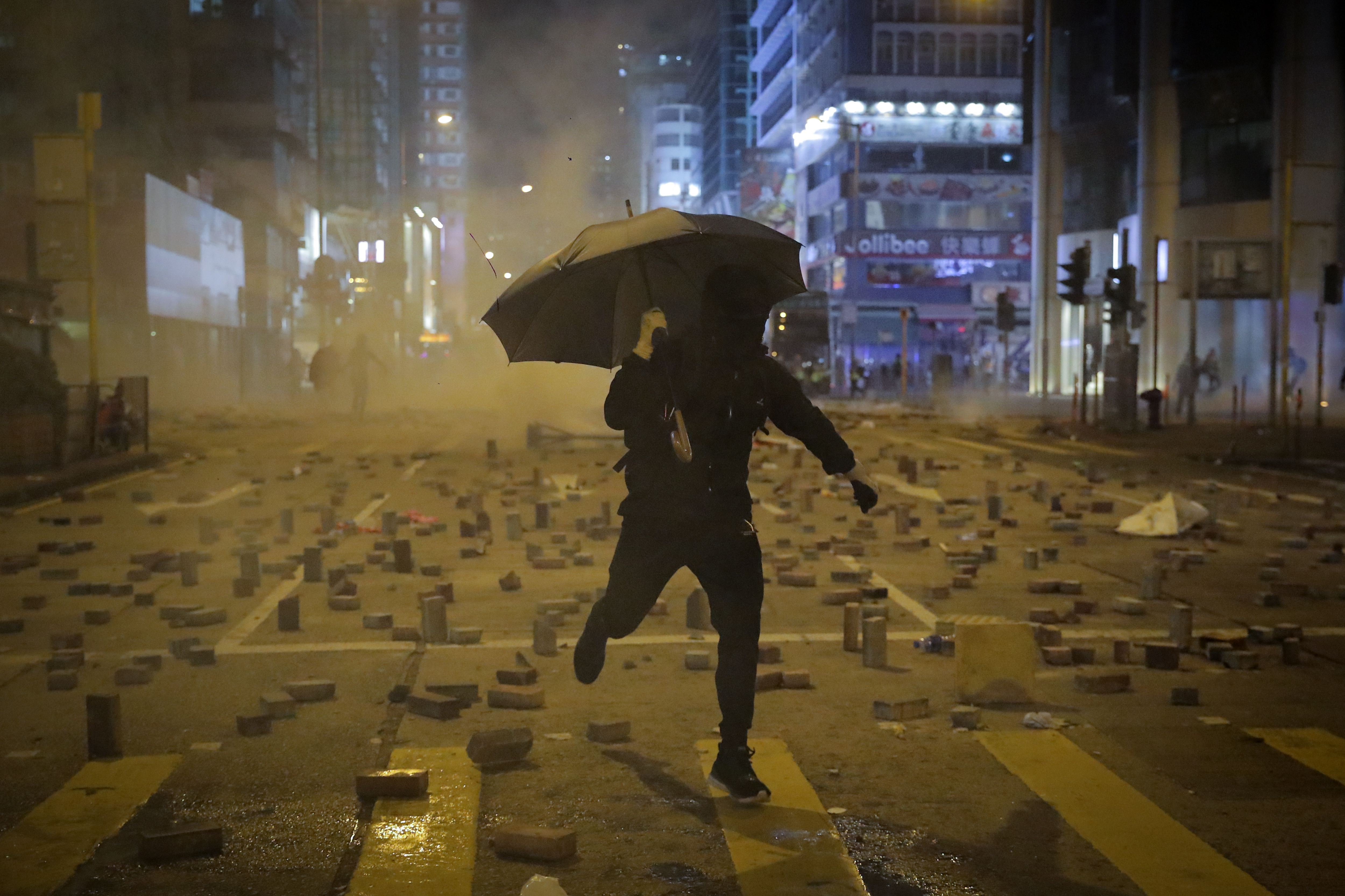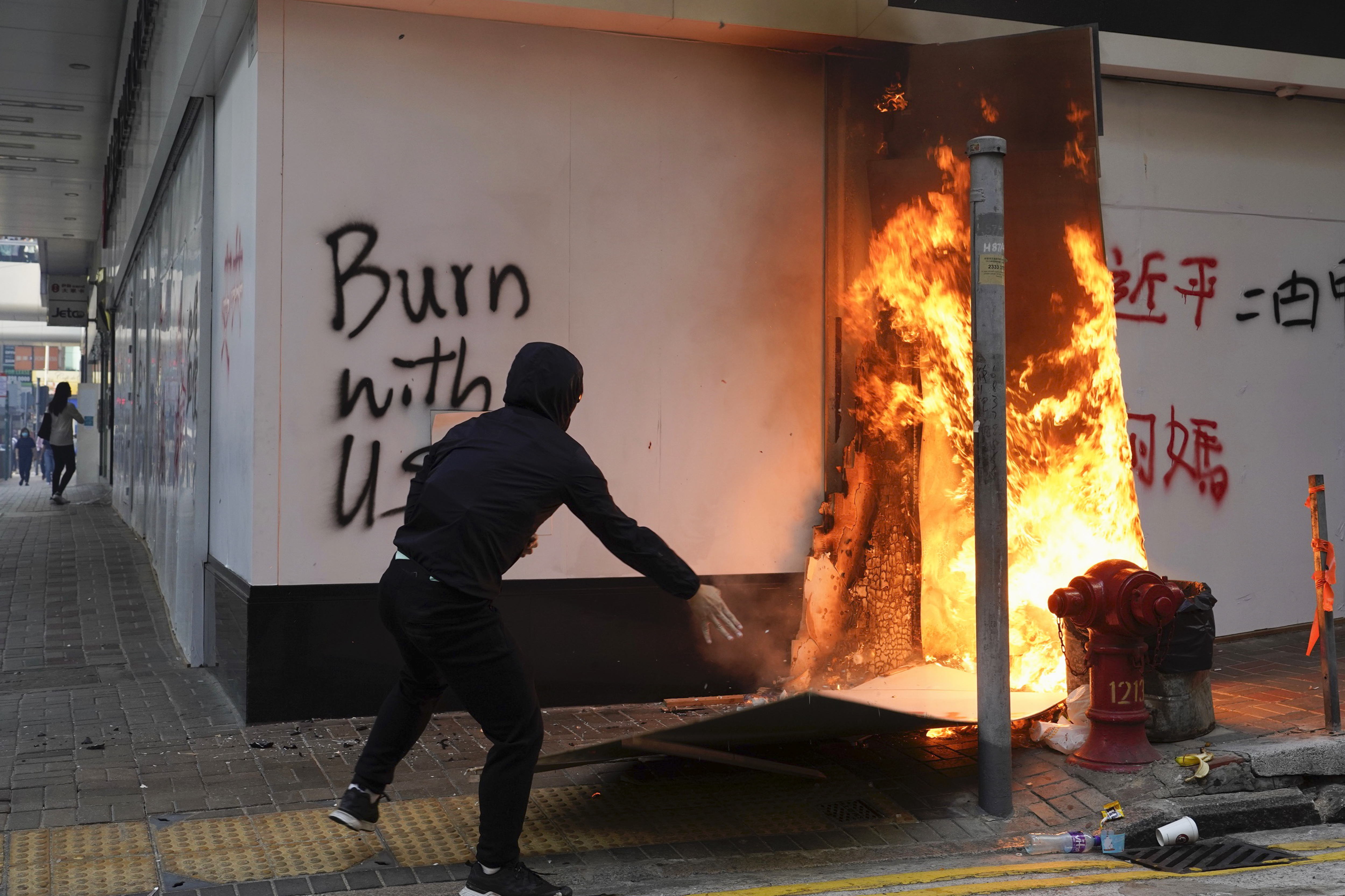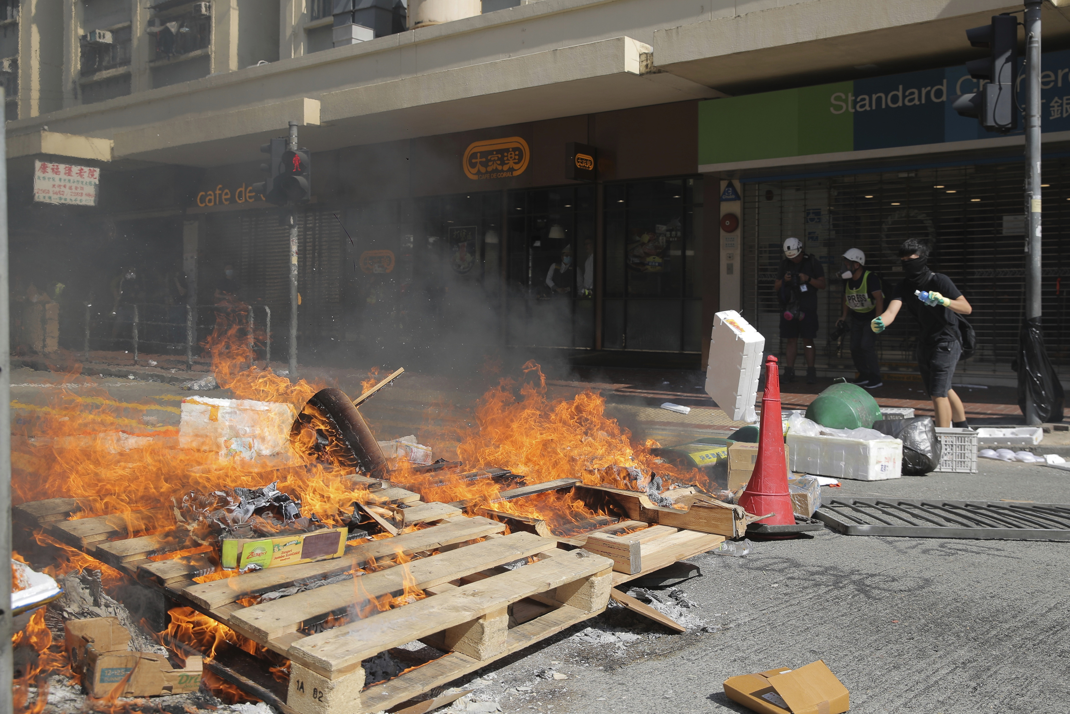 Un manifestante è stato ferito da un colpo di arma da fuoco sparato dalla polizia antisommossa ed è in condizioni critiche. In altra parte della città un uomo è stato dato alle fiamme, sembra perché pro-Cina.