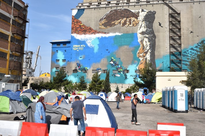 In fondo i campi del Pireo sono degni: tende sulle banchine e servizi assicurati, seppur con wc chimici. Niente a che vedere con Idomeni. Nessuno qui parla inglese. Gente semplice. Forse i più poveri con poca cultura. Ma un uomo con due bambini uno dei quali in carrozzina, vedendoci arrivare ci accoglie con un caloroso "welcome" che dice civiltà. Mentre un enorme murales della Niké, della vittoria, custodisce gli sconfitti della storia.