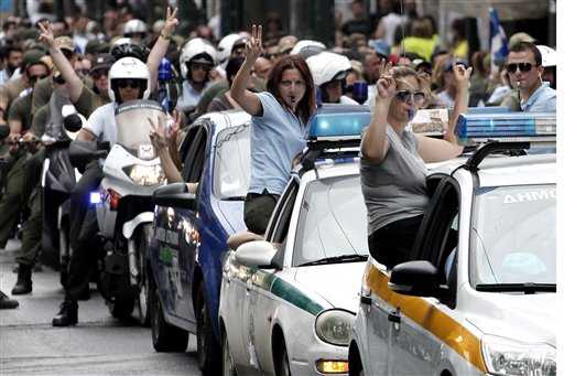Licenziamento o cassa integrazione per 25 mila dipendenti statali: è una delle pesantissime condizioni poste alla Grecia per ottenere un'altra tranche di aiuti economici da Ue, Bce e Fmi. Misure accettate dal governo, ma non dalla popolazione, che è scesa in strada per protestare (foto Ap).