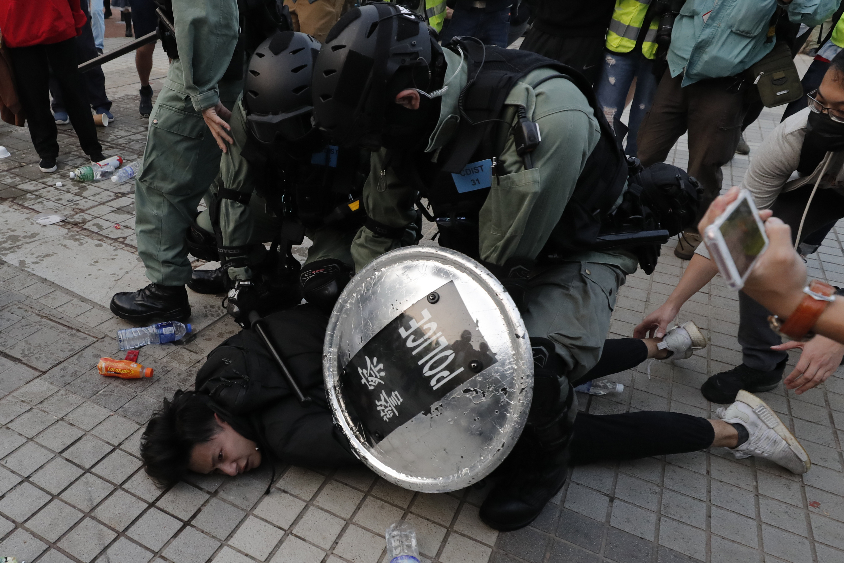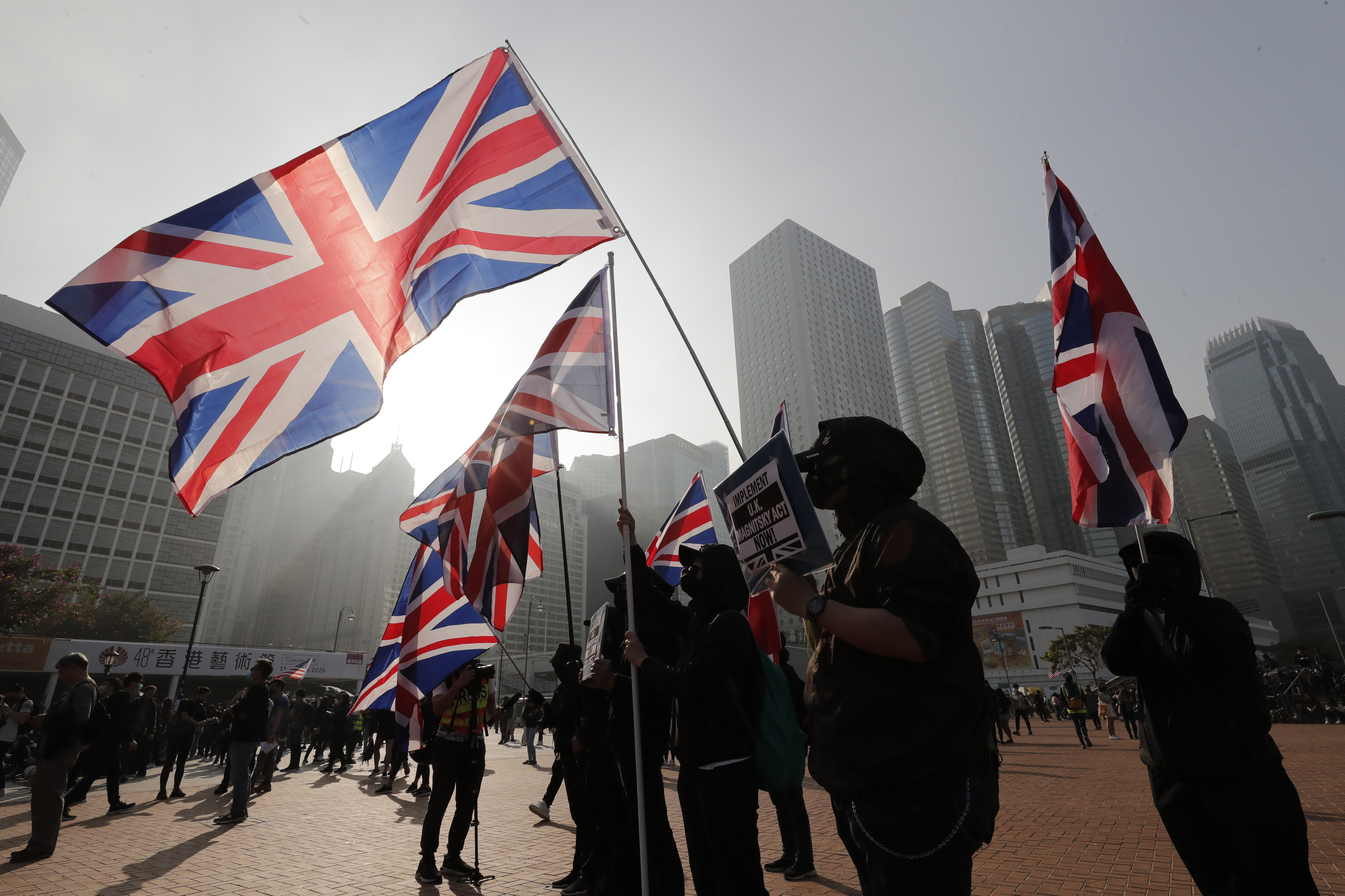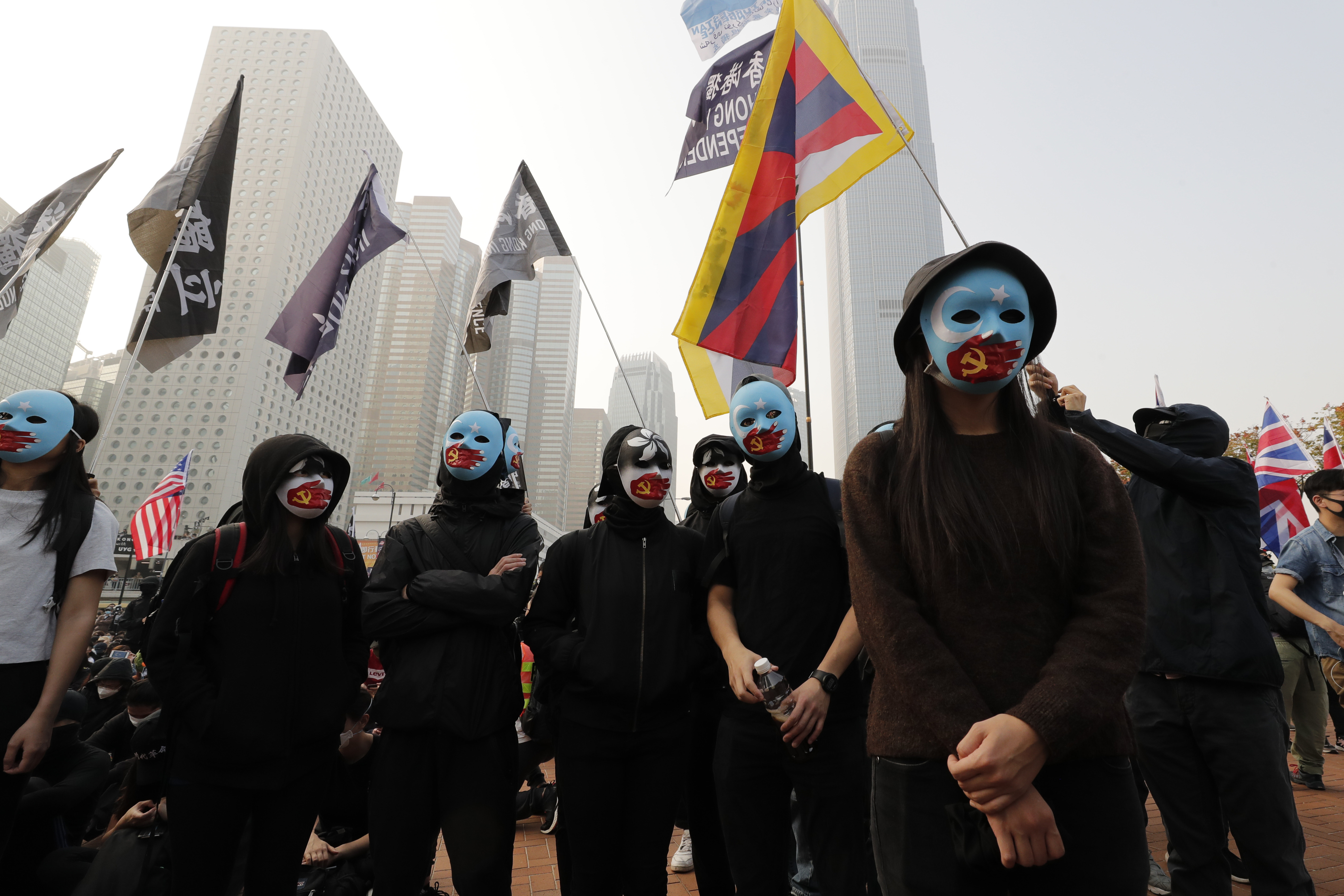 Maschere sul volto e sventolio di bandiere inglese e statunitense, mentre i simboli cinesi vengono gettati a terra con disprezzo. La protesta degli abitanti di Hong Kong, sempre duramente repressa dalla polizia, si colora del supporto alla lotta degli Uiguri per i diritti umani e la sopravvivenza come cultura (foto AP/ Lee Jin-man).