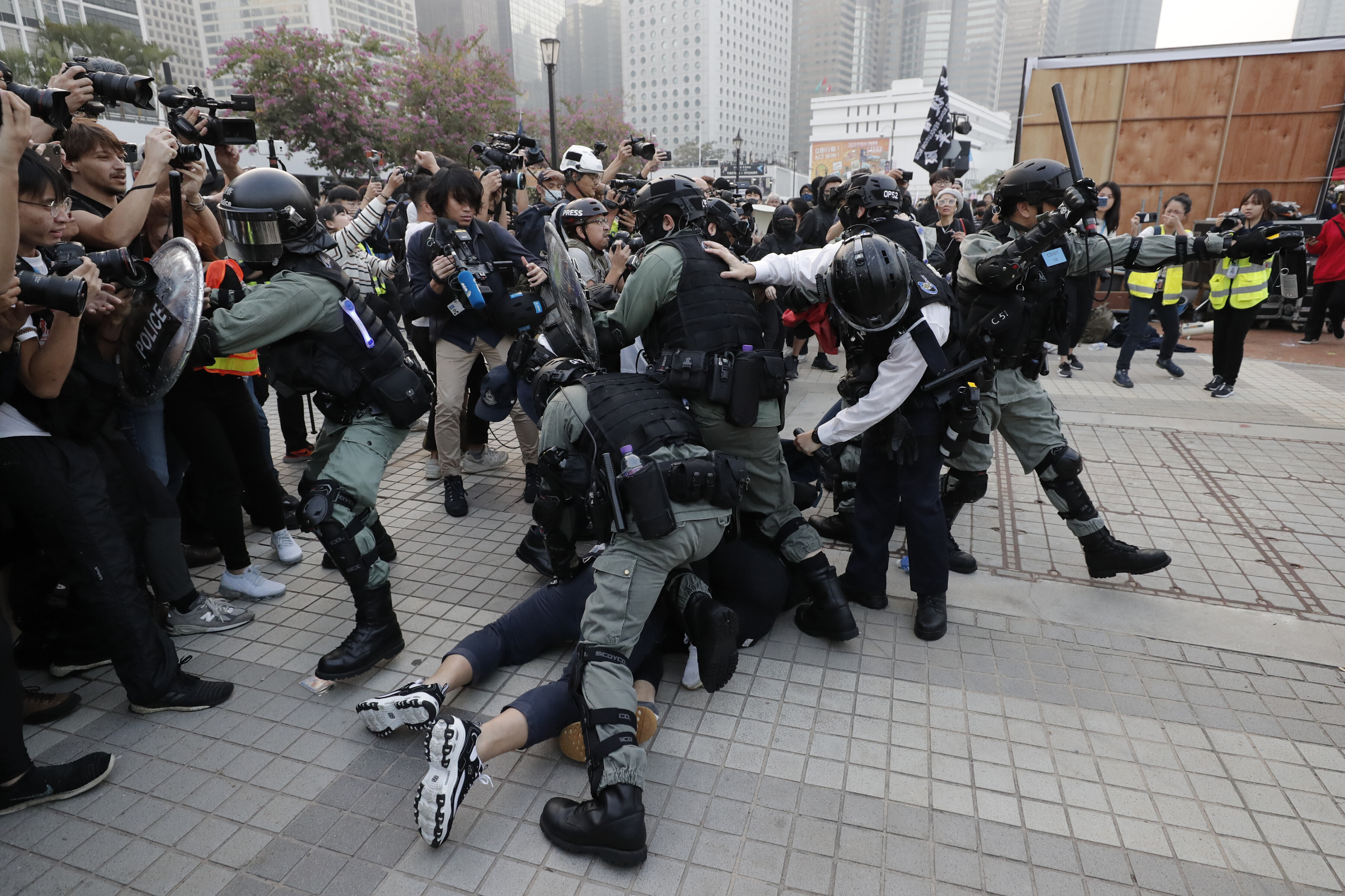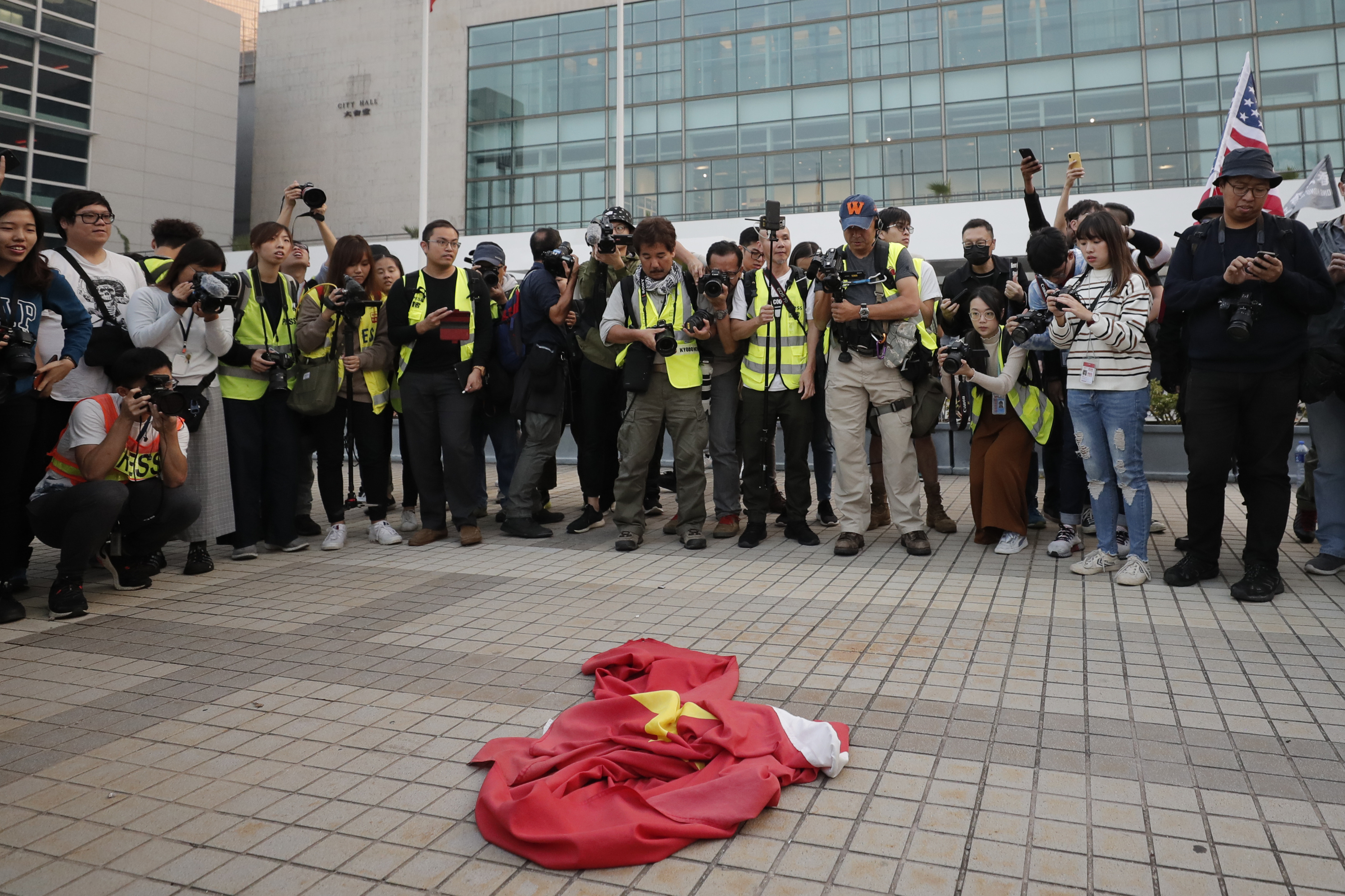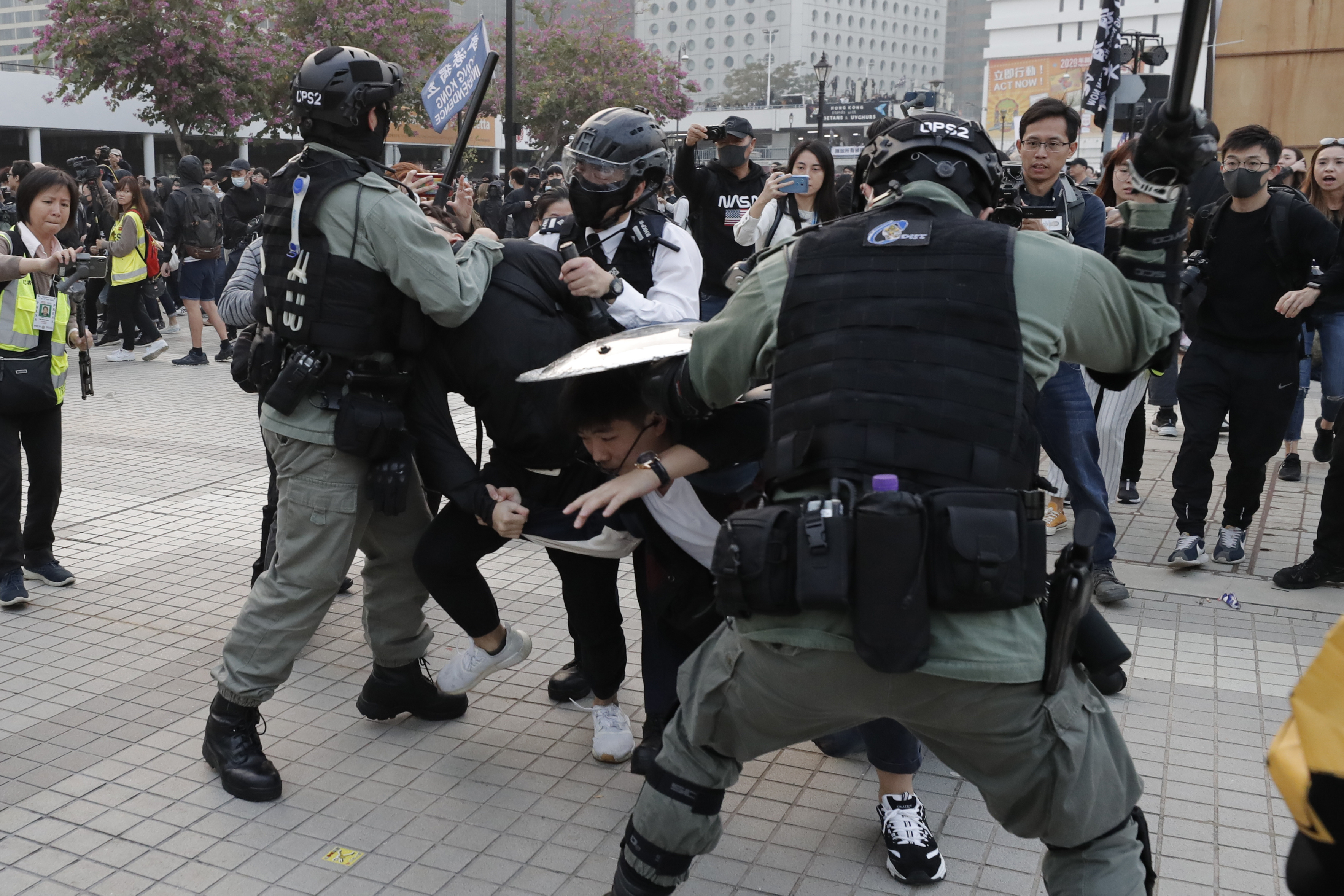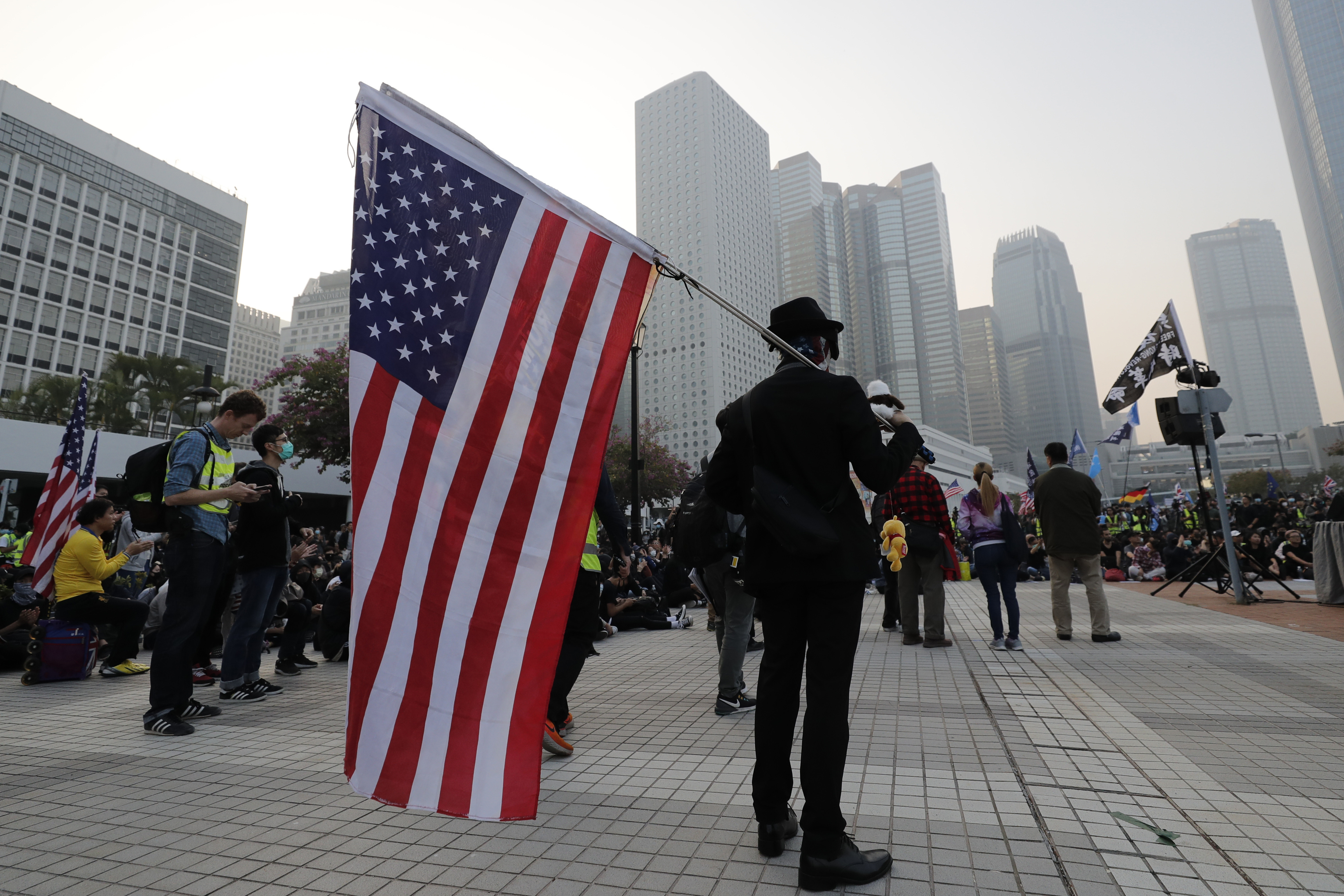 Maschere sul volto e sventolio di bandiere inglese e statunitense, mentre i simboli cinesi vengono gettati a terra con disprezzo. La protesta degli abitanti di Hong Kong, sempre duramente repressa dalla polizia, si colora del supporto alla lotta degli Uiguri per i diritti umani e la sopravvivenza come cultura (foto AP/ Lee Jin-man).