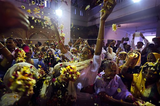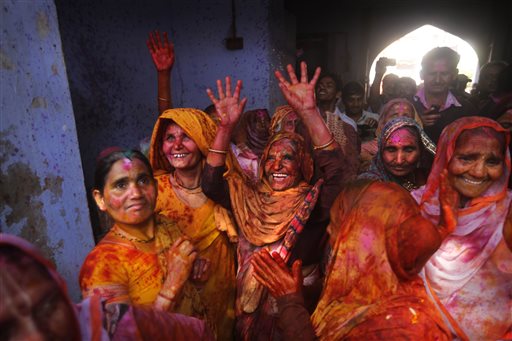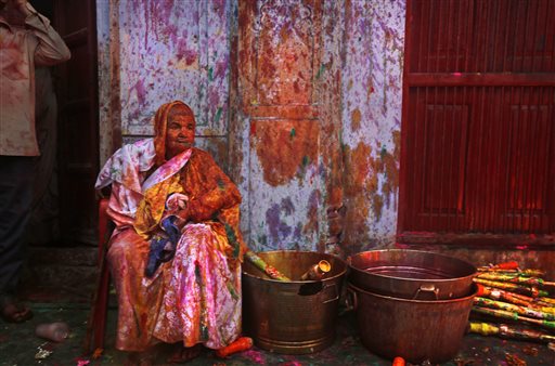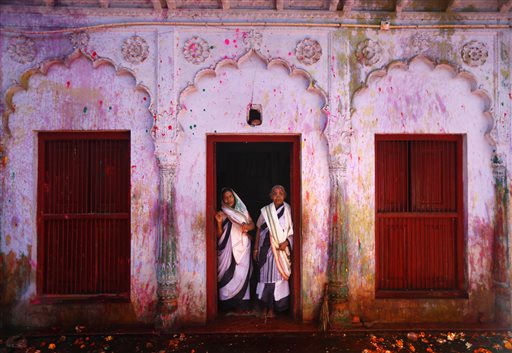 Vedove indù lanciano polveri e petali colorati per celebrare la festa di Holi. Le donne che hanno perso il marito sono per la cultura indù, bandite dalla famiglia perchè portano sfortuna. Tante di loro si riducono a vivere sui marciapiedi o finiscono in prigione. Ora l'associazione internazionale Sulabh ha iniziato un programma di protezione dove anche i momenti di festa servono a restituire una vita negata.