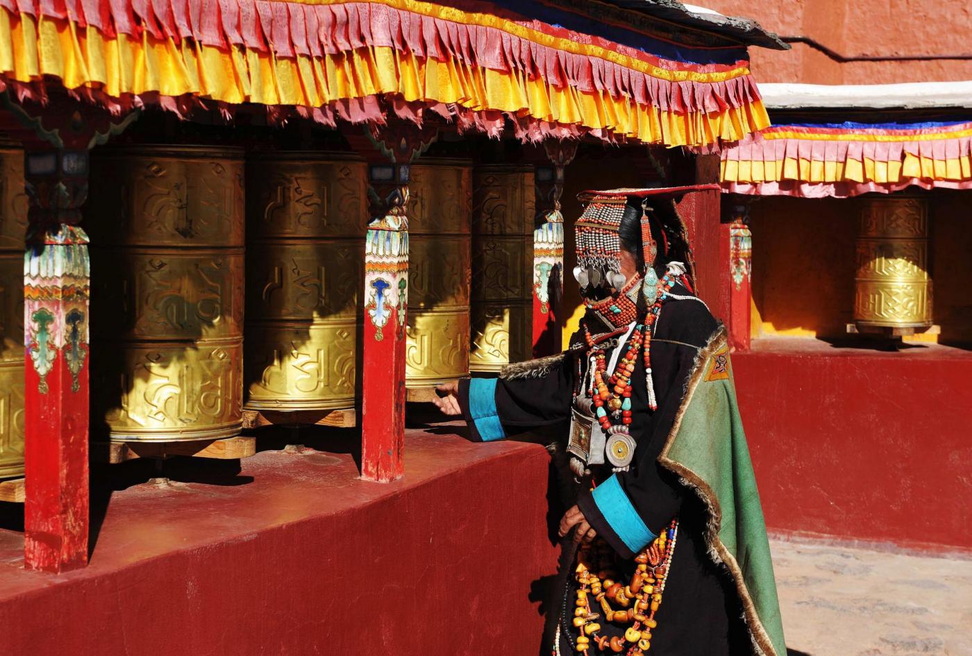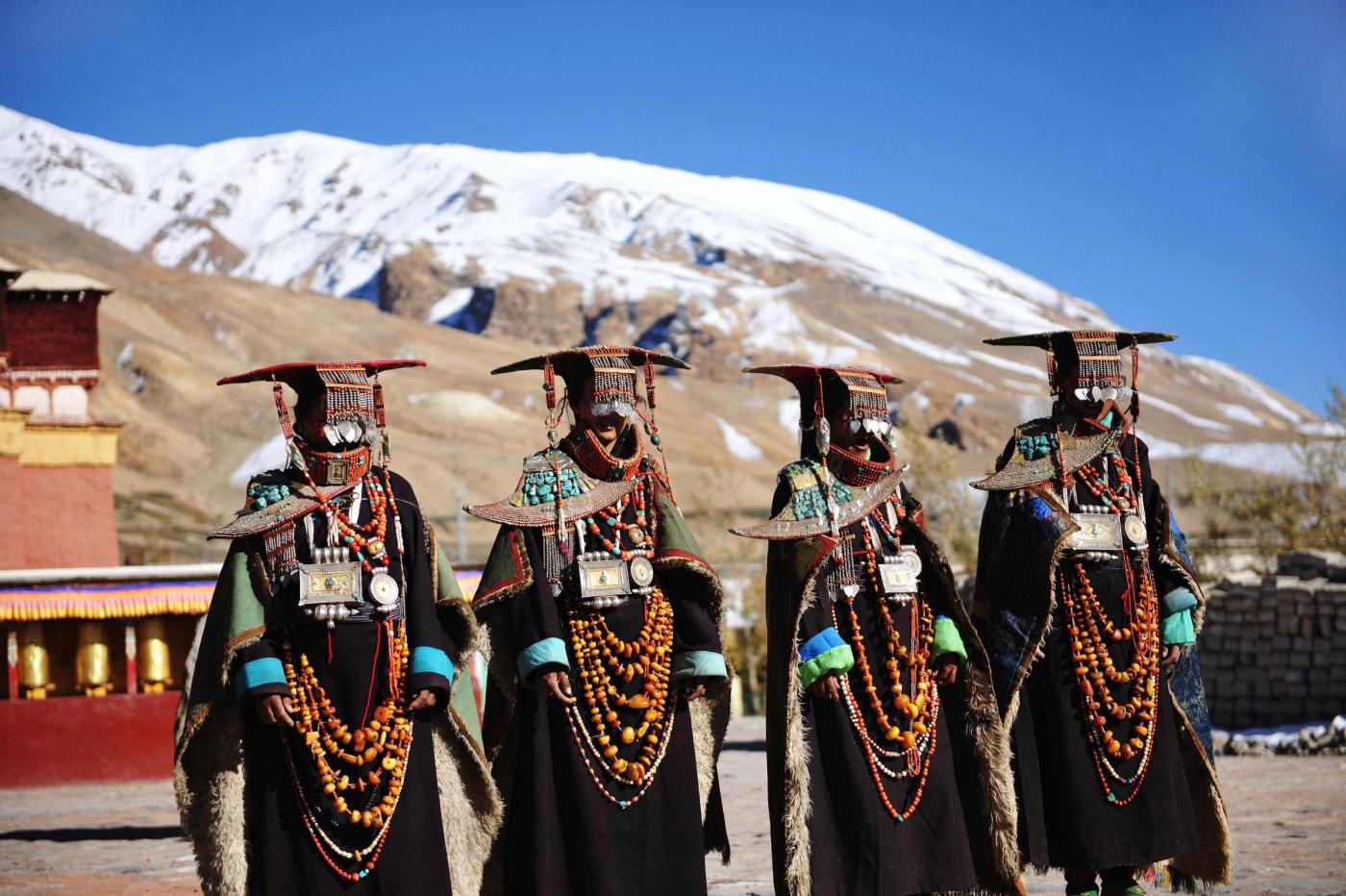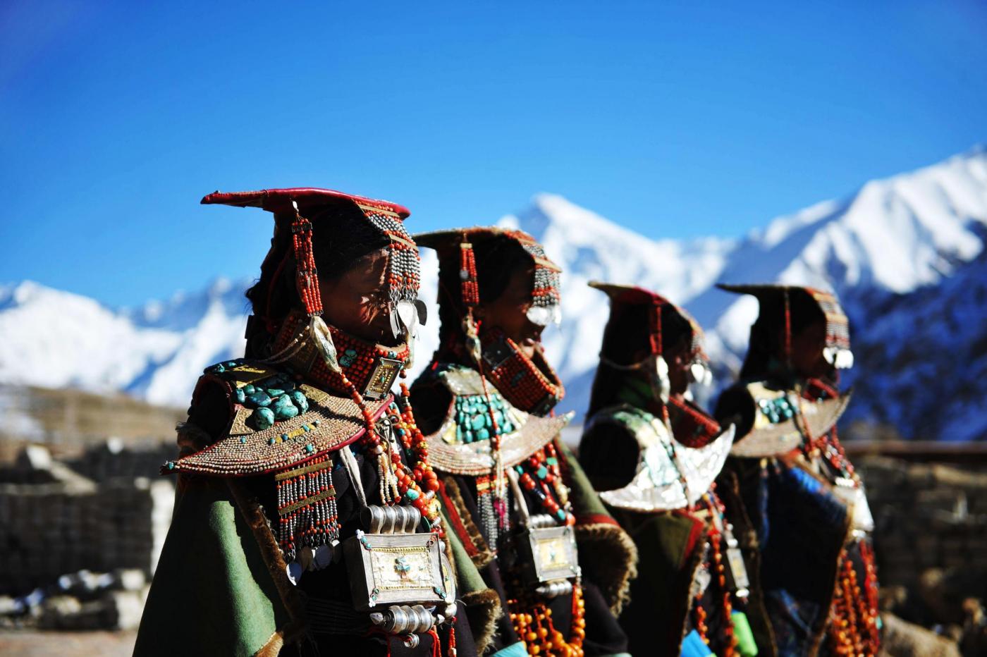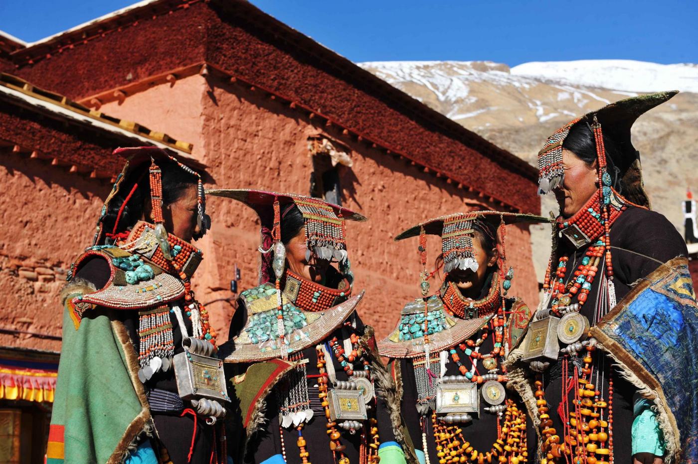 I costumi indossati dalle donne di Kegya, un villaggio del Tibet hanno mille anni di vita. Gli accessori realizzati con pezzi di cera d’api, perle, coralli rossi e delicate decorazioni in oro e argento hanno un valore inestimabile e vengono conservati con venerazione, essendo un dono degli antenati Burang